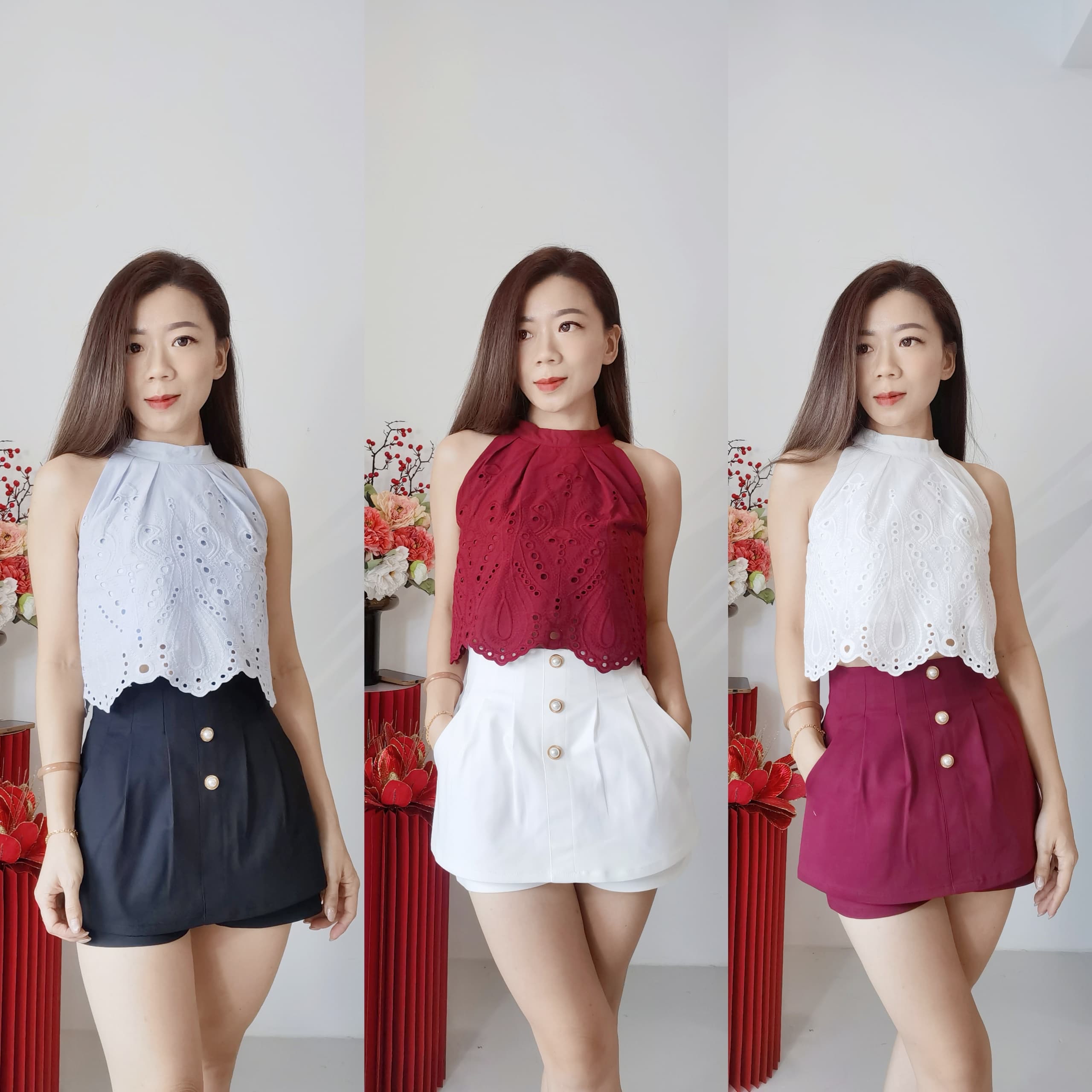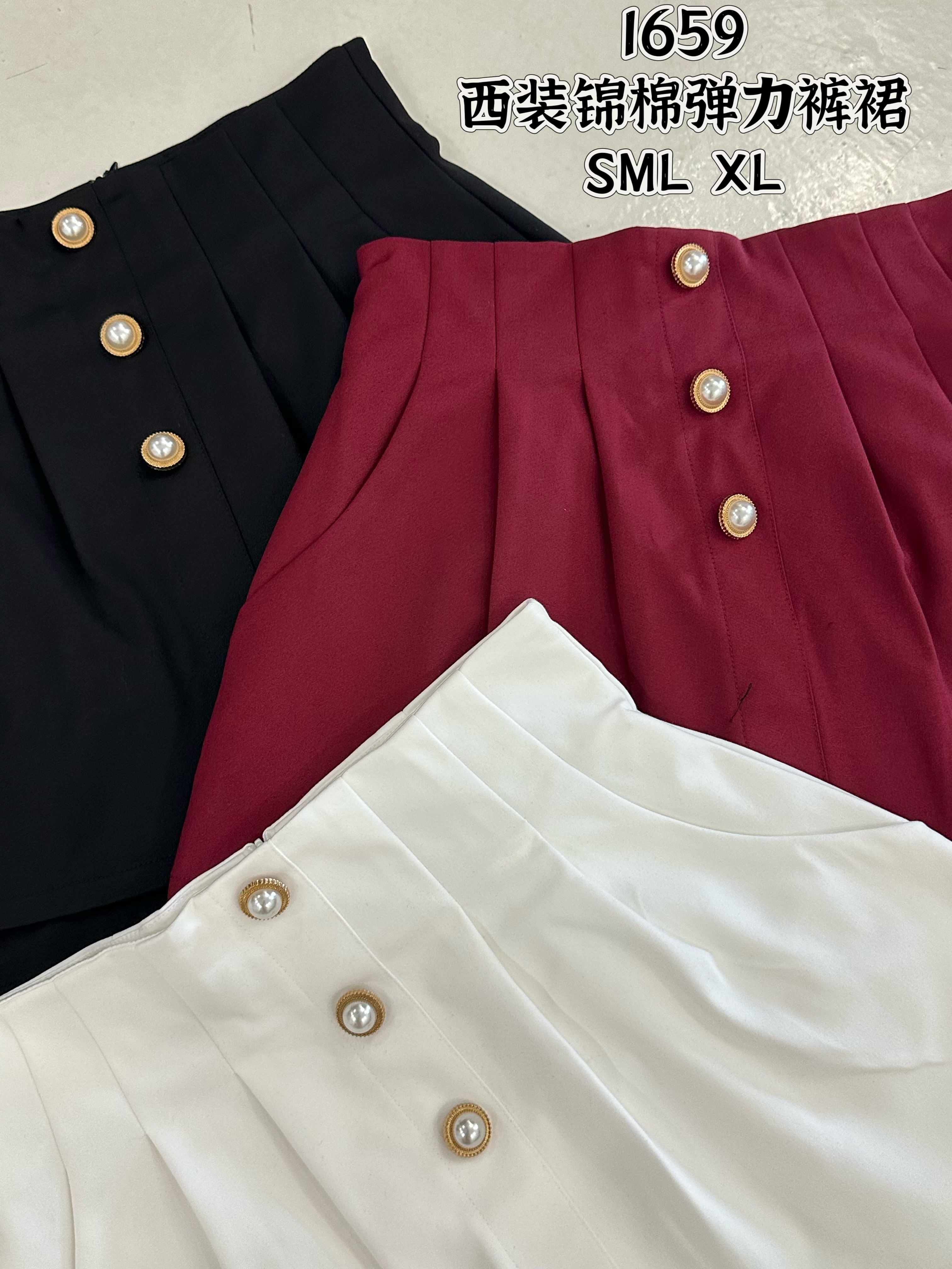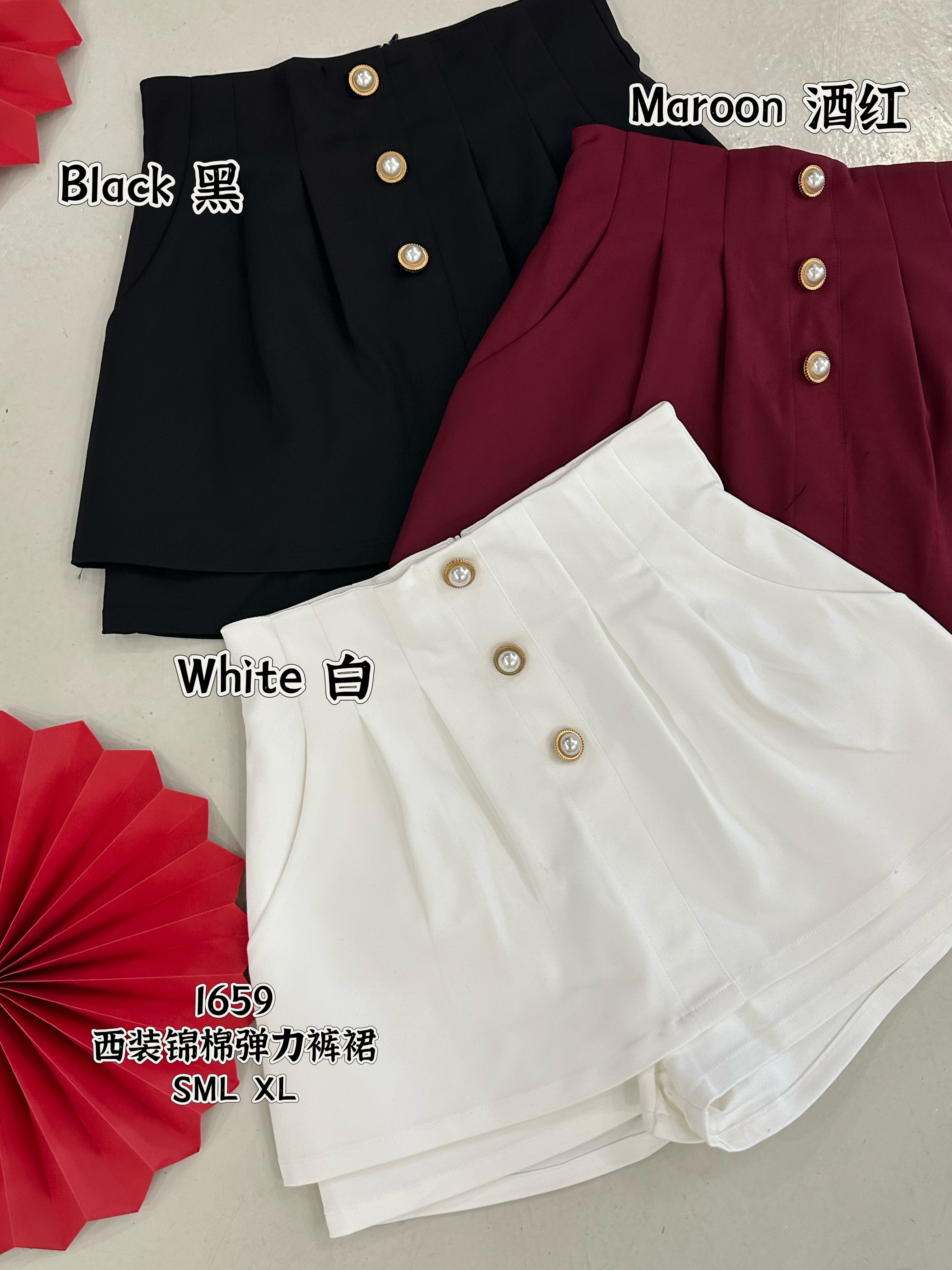 新品推荐✨1659 DESIGN SKIRT PANT 显瘦款高腰裤裙 西装锦棉面料、 有弹性、显腿长裤裙、 搭配珍珠扣显气质、2边有口袋👍 cutting很美🥰 颜色:黑SML XL、 白SML、酒红SML S SIZE 腰围 24-25寸 臀部 94cm 长36cm M SIZE 腰围 26-27寸 臀部 98cm 长36cm L SIZE 腰围 28-29寸 臀部 102cm 长39cm XL SIZE 腰围 30-31寸 臀部 106cm 长40cm 根据平时的size下单即可。 博主平时是穿S, 此刻穿S刚好,供大家参考。