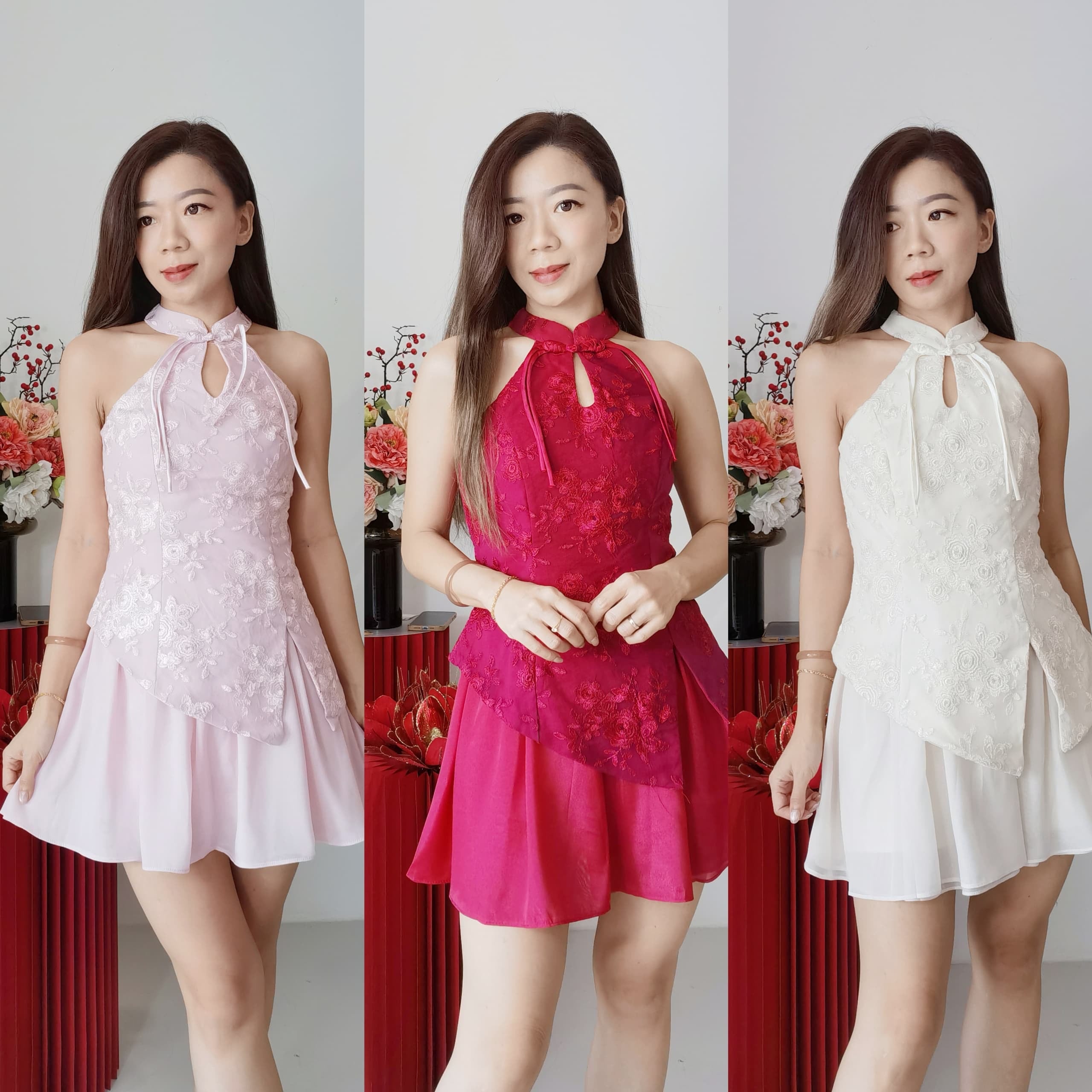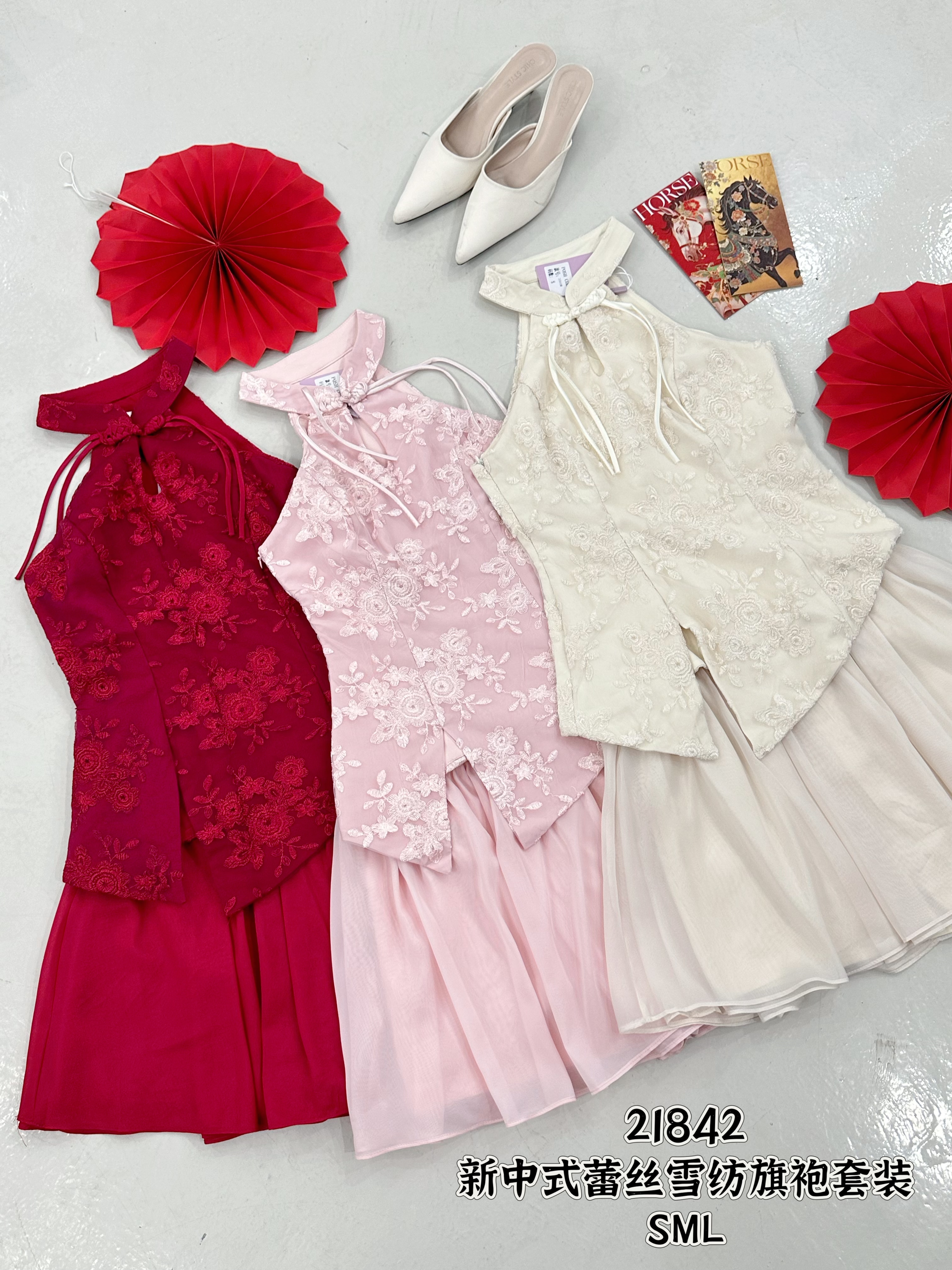 新品推荐✨🧧 21842 CNY PREMIUM SET 新中式蕾丝网纱旗袍套装 上衣蕾丝面料、无弹性 、领子活盘扣可以拆、有里布的。 裙子双层高质量网纱面料、有裤子、无弹性、后面隐形拉链。 这款甜美气质😍😍😍 颜色:酒红、粉、米白 S SIZE 胸围 32寸 长60cm 腰围 25-26寸 长39cm M SIZE 胸围 34寸 长62cm 腰围 27-28寸 长40cm L SIZE 胸围 36寸 长64cm 腰围 29-30寸 长40cm 正常尺寸,根据平时的SIZE下单即可 博主平时穿S,此款穿S刚好 供大家参考。☺️