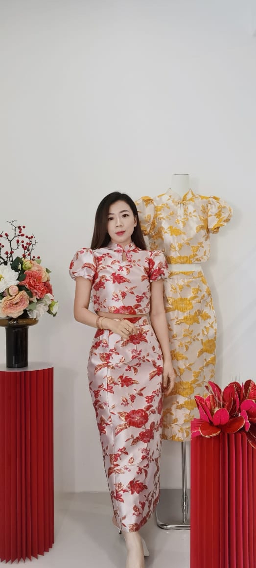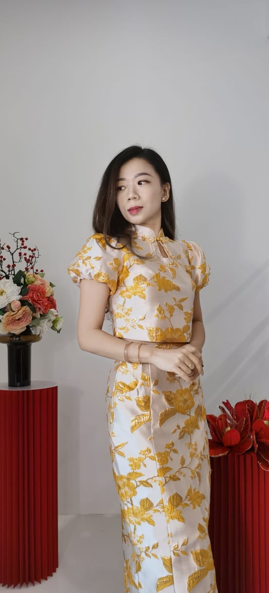 🧧 新品推荐 ✨CNY 高定系列新改良提花工艺套装 颜色:黄金、红金 面料:无弹! 正常尺码 根据平时的size下单即可。 S SIZE 衣: 胸围 84cm 长36cm 裙: 腰围 68cm 臀部96cm 长88cm