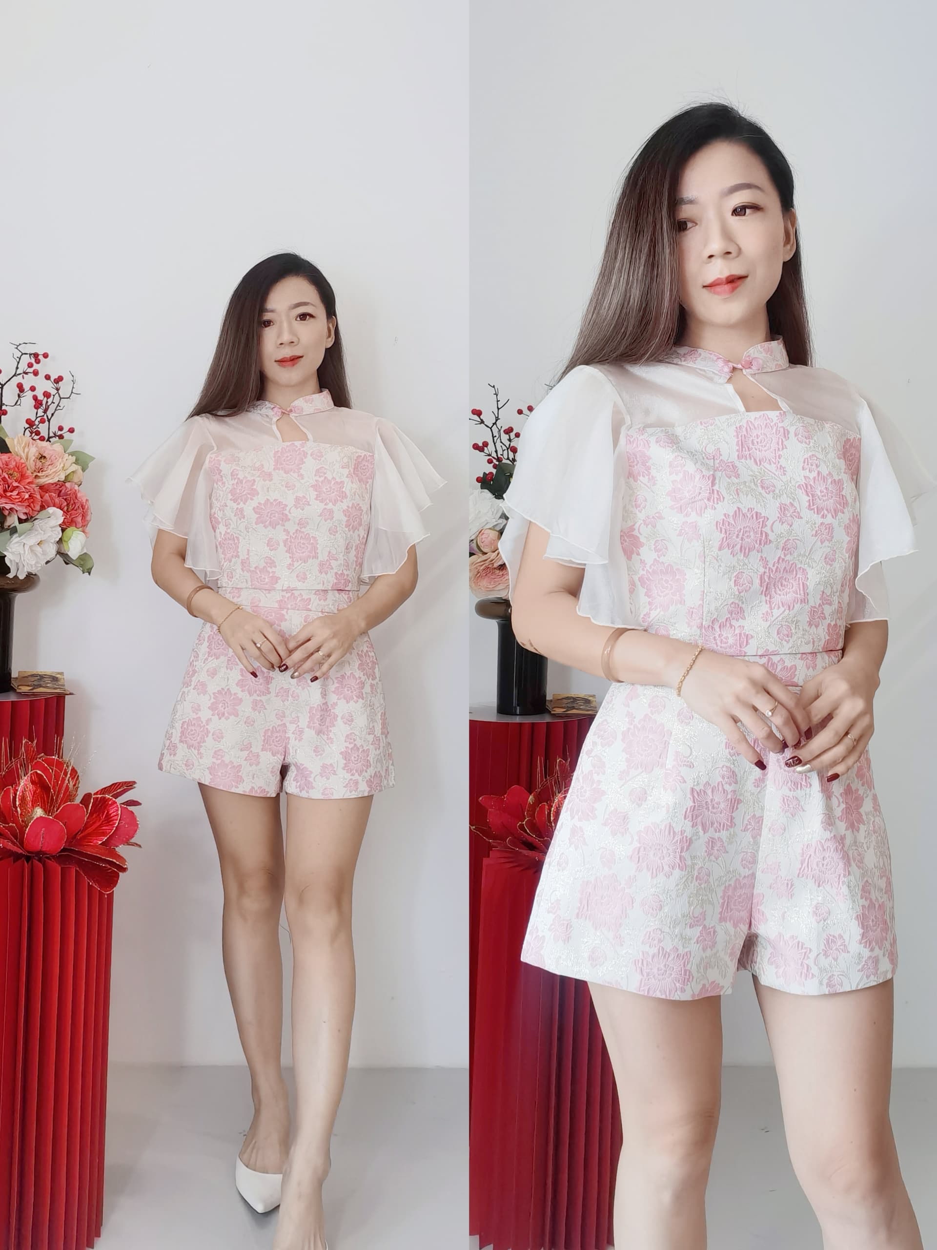新品推荐✨ 528048 CNY PREMIUM SET 高定提花荷叶袖雪纺拼接新改良旗袍套装🤩 时装提花面料、袖子拼接雪纺很有气质、不刺痒。绝美😍 S SIZE 胸围32-34寸 长39cm 腰围25-26寸 臀96cm 长35cm M SIZE 胸围34-36寸 长40cm 腰围27-28寸 臀100cm 长36cm 正常尺寸 根据平时的size下单即可. 博主平时穿S,此刻穿S 舒服的, 供大家参考。