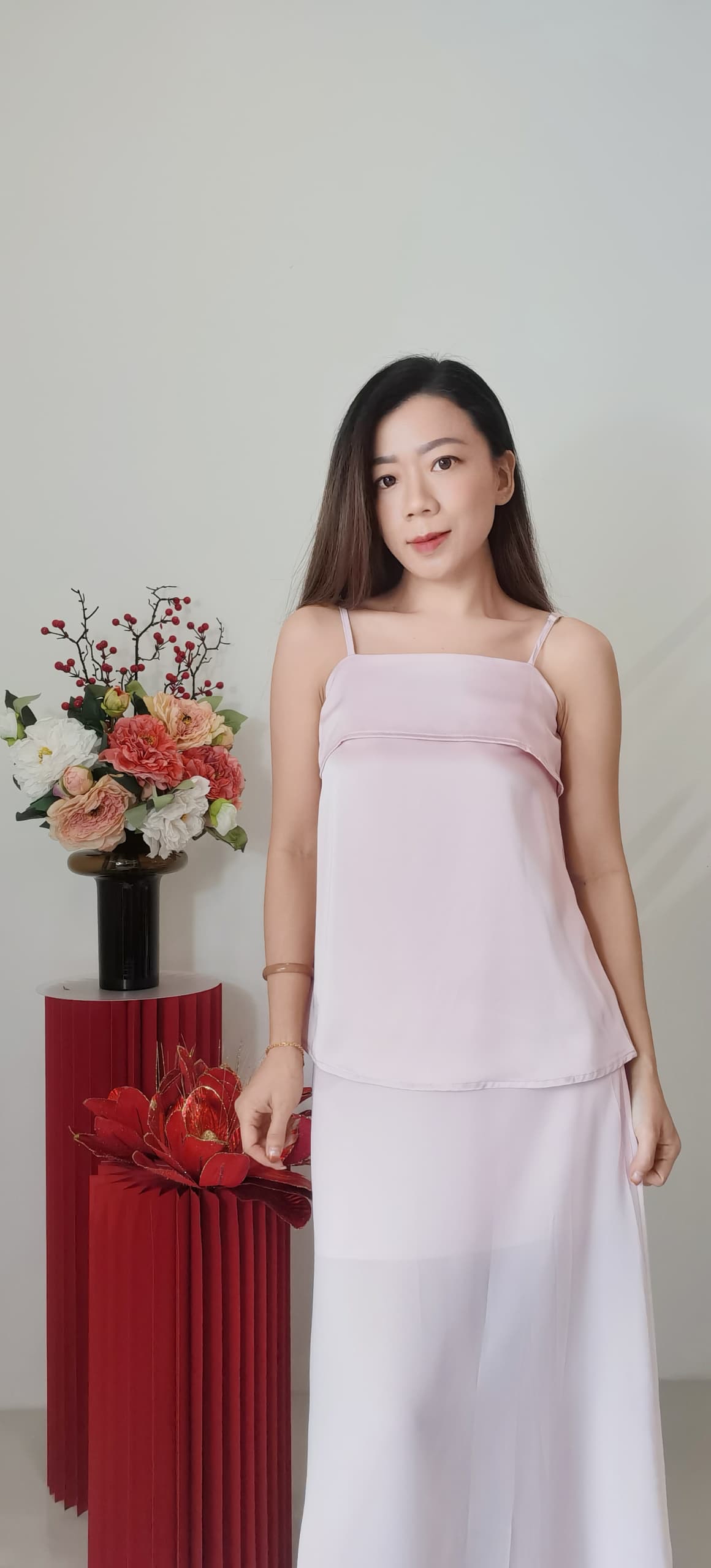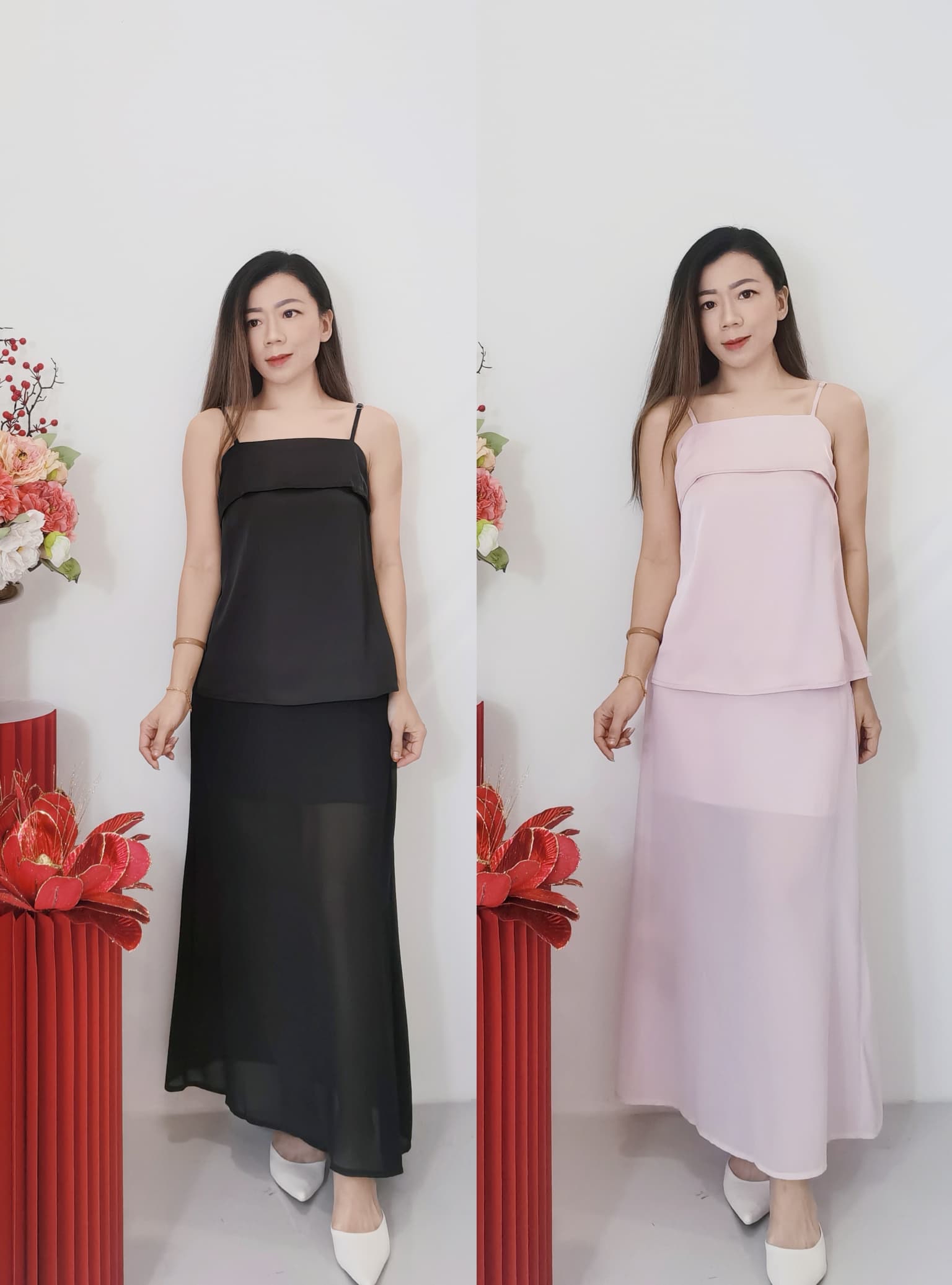 精品推荐✨DRESS SET 98551 高品名媛气质套装 COLOUR : 黑、杏、粉 优质段面上衣布料 无弹性 吊带可以调节 双层里布 裙子雪纺面料 、里布品质很好是采用缎面同款面料 、是裙子设计 ! 适合上班 、逛街 、聚会、dinner S SIZE 上衣:胸围84cm 腰围78cm 长62cm 裙子:腰围68cm 臀部100cm 长94cm M SIZE 上衣:胸围88cm 腰围82cm 长62cm 裙子:腰围72cm 臀部104cm 长94cm 根据平时的size下单即可 参考:博主163cm 高/ 52kg / 穿S 舒服的 大家供参考😊