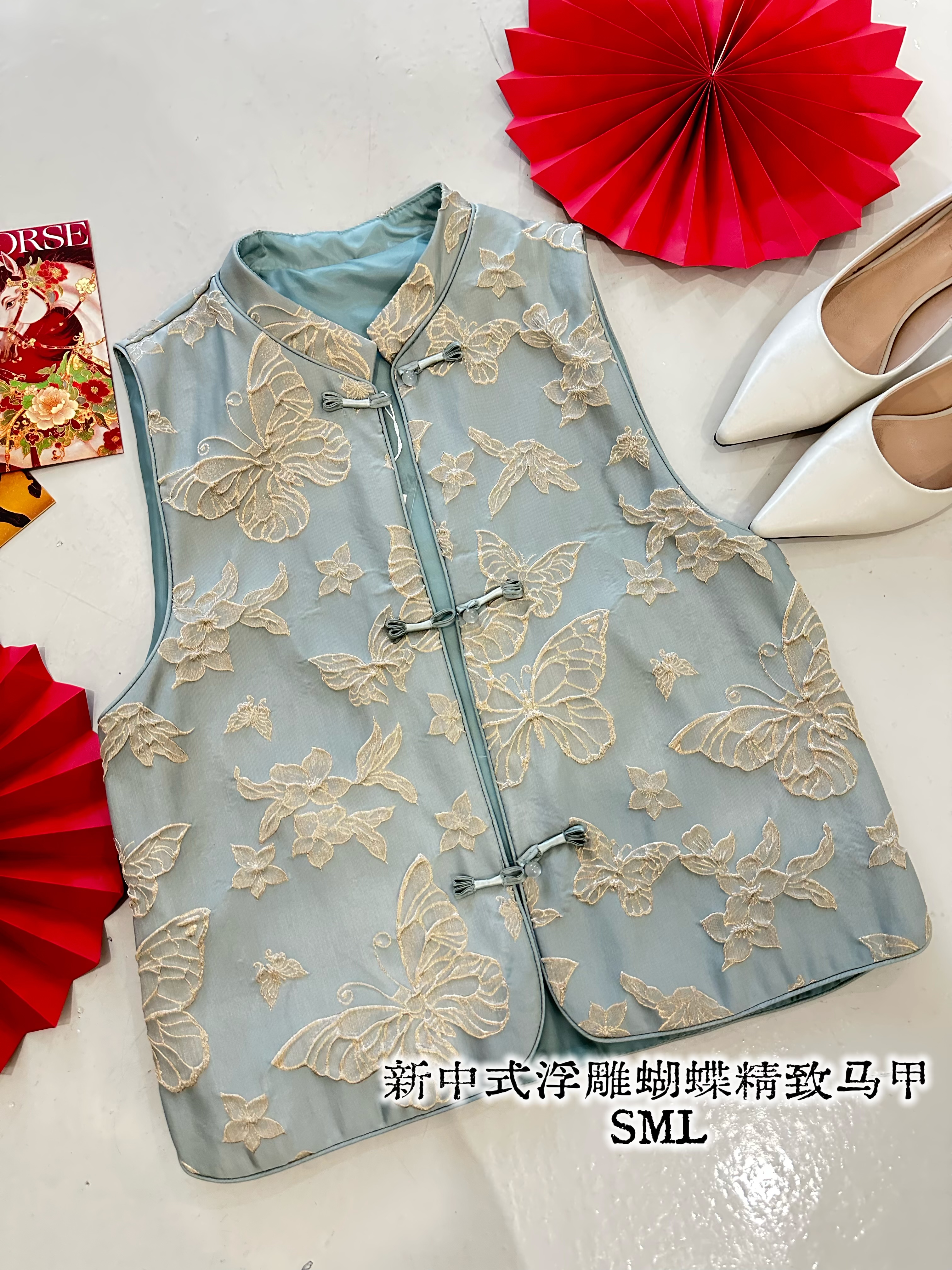 新品推荐✨新中式缎面浮雕蝴蝶马甲外套 颜色:蓝 缎面面料、浮雕精致蝴蝶图、有里布、无弹性 、品质超好 😍 非常推荐👍 S SIZE 胸围 92cm 长55cm M SIZE 胸围 100cm 长55cm L SIZE 胸围 108cm 长56cm 正常尺寸,根据平时的尺寸下单。 博主平时穿S,此款穿S宽松版型,供大家参考。☺️