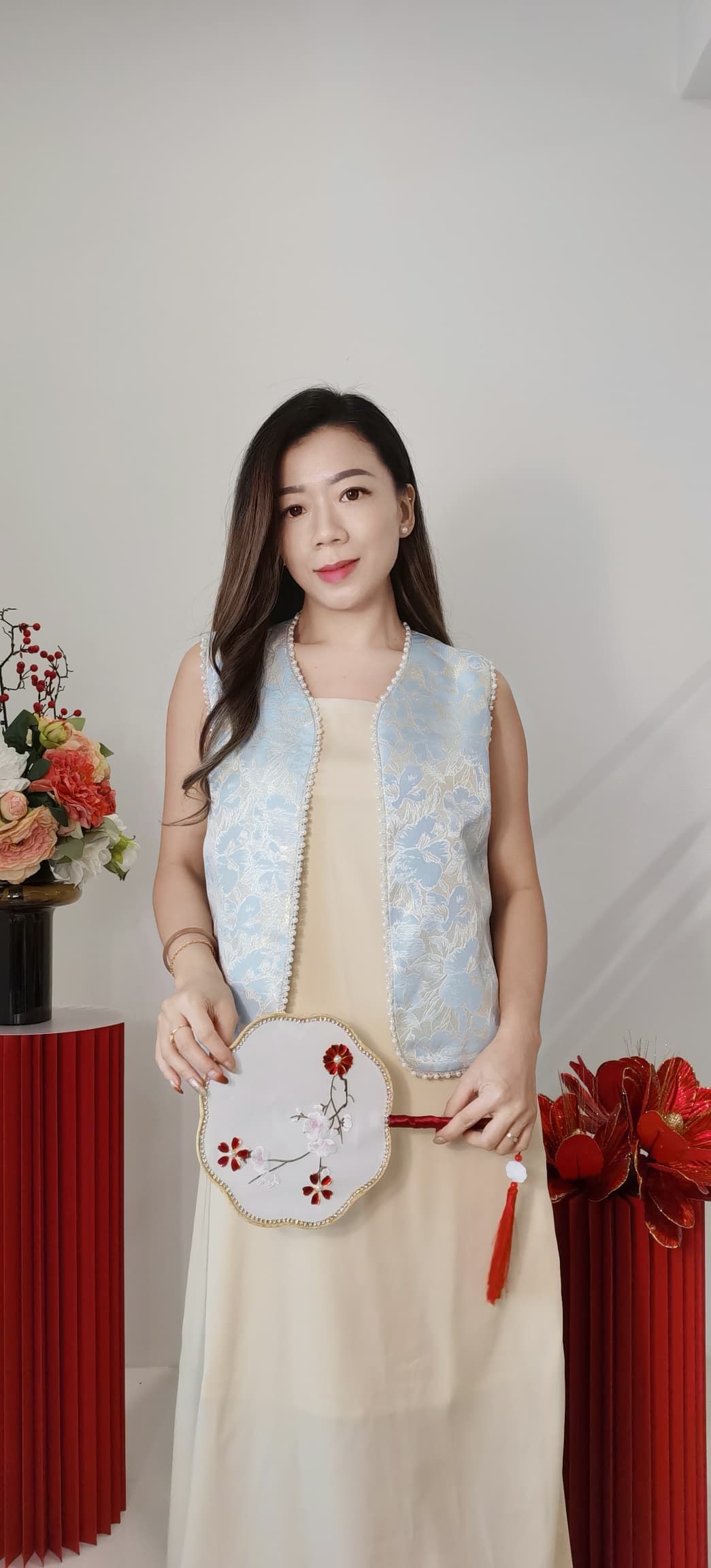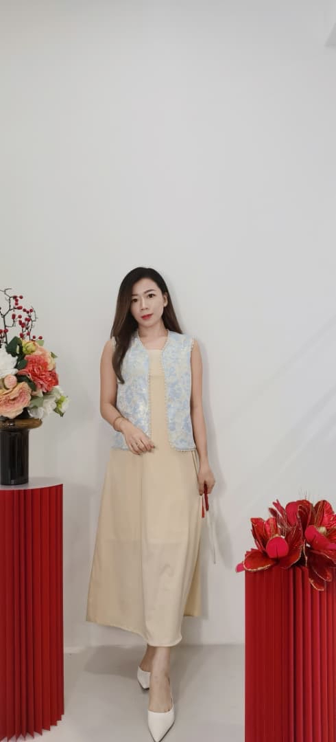 21803 CNY 高定新中式改良款2件式连衣裙马甲套装✨ *太美啦😍* 解锁开运新穿搭 颜色:蓝田生玉、金碧辉煌 📌丝滑吊带长裙 ,吊带可以调节,有内层不透,无弹。可修饰肚腩 马甲提花烫金布料、 无弹性 、边拼珠子闪闪发亮 精致无比 S SIZE 马甲:胸围 94cm 长54cm 裙:胸围 86cm 腰围 82cm 长114cm M SIZE 马甲:胸围 98cm 长55cm 裙:胸围 92cm 腰围 86cm 长117cm L SIZE 马甲:胸围 102cm 长56cm 裙:胸围 98cm 腰围 90cm 长120cm 根据平时的size下单即可。 博主163cm/52kg 平时S 这款穿S 舒服的 有空间 供参考😊
