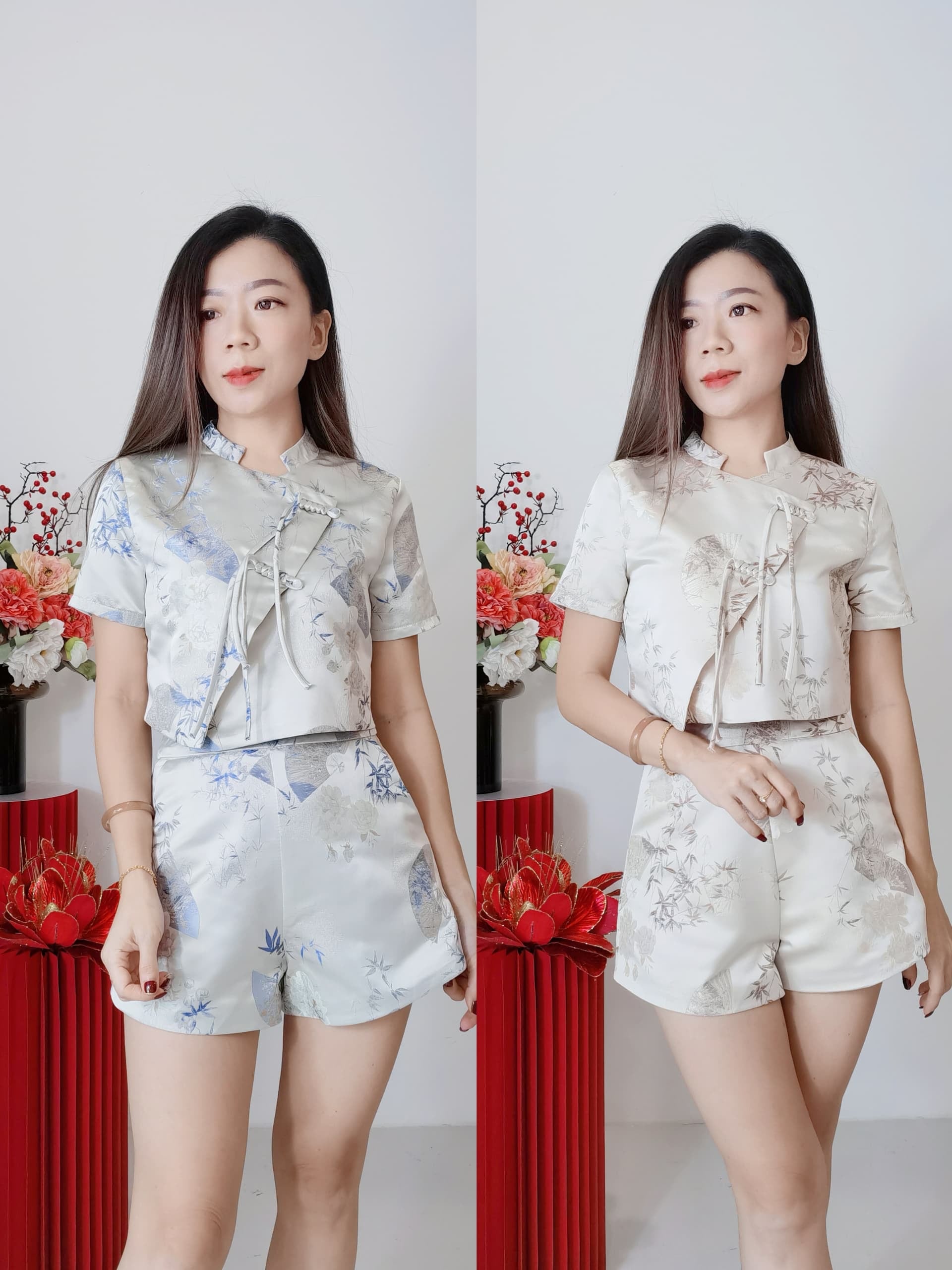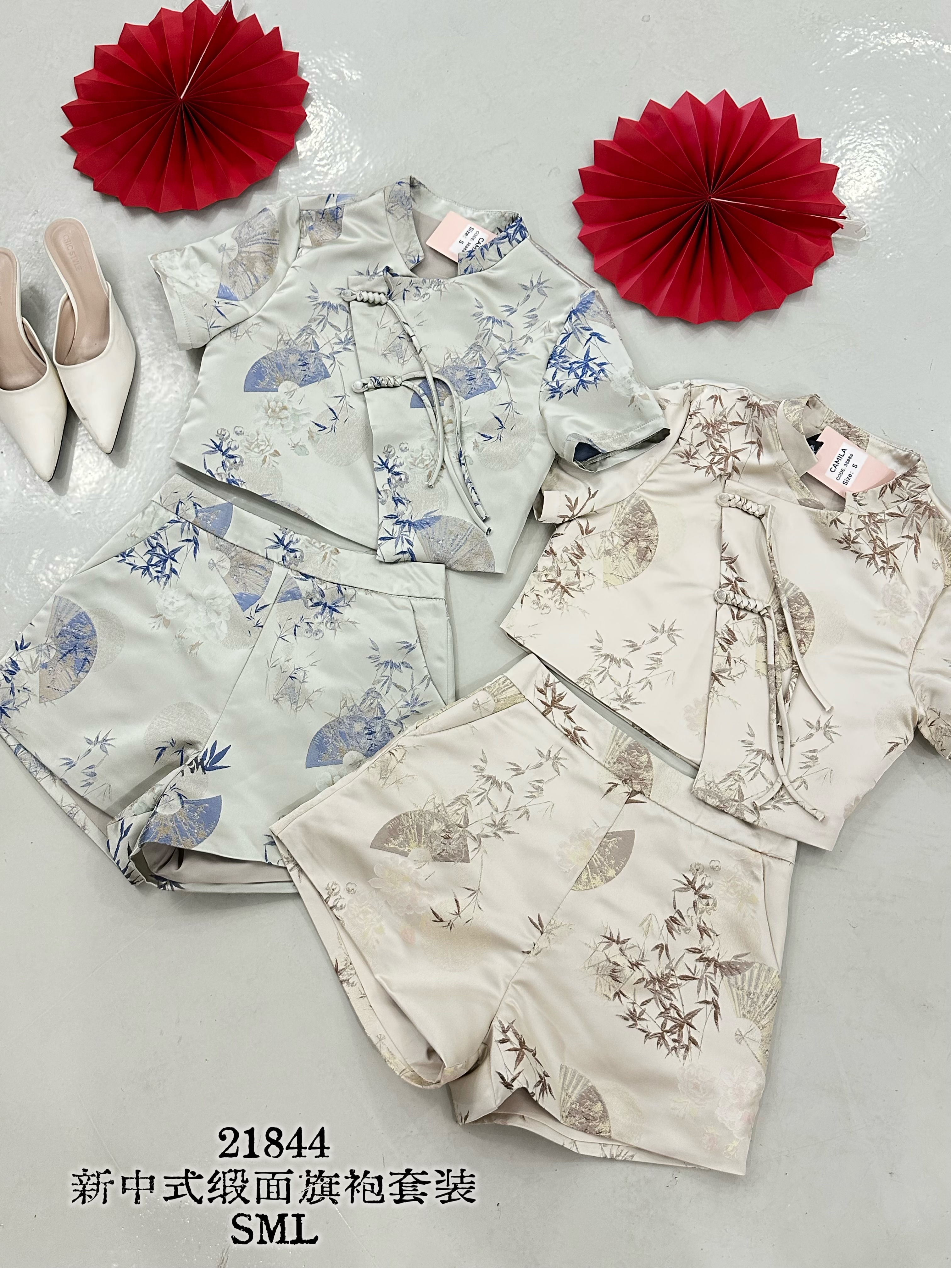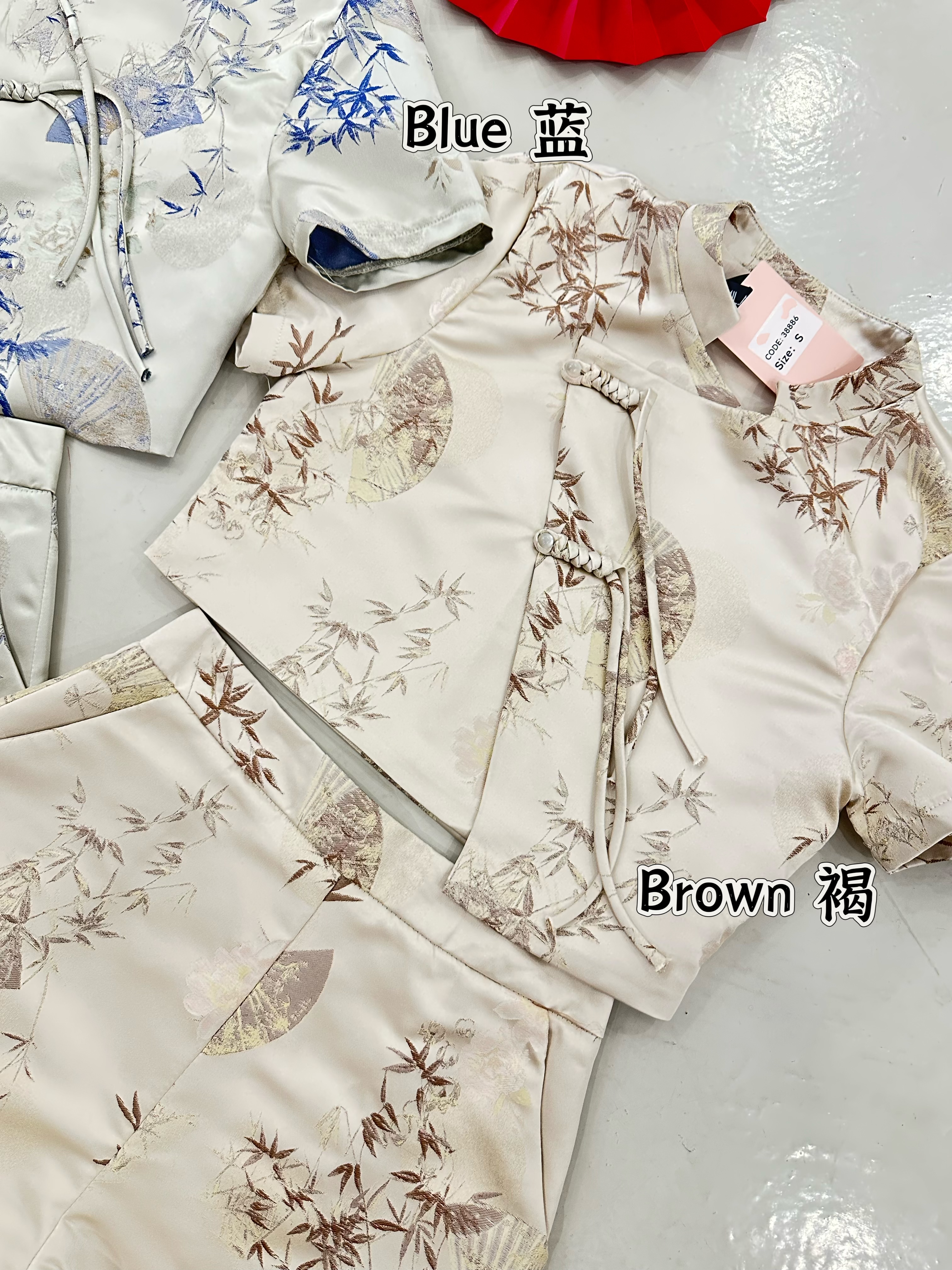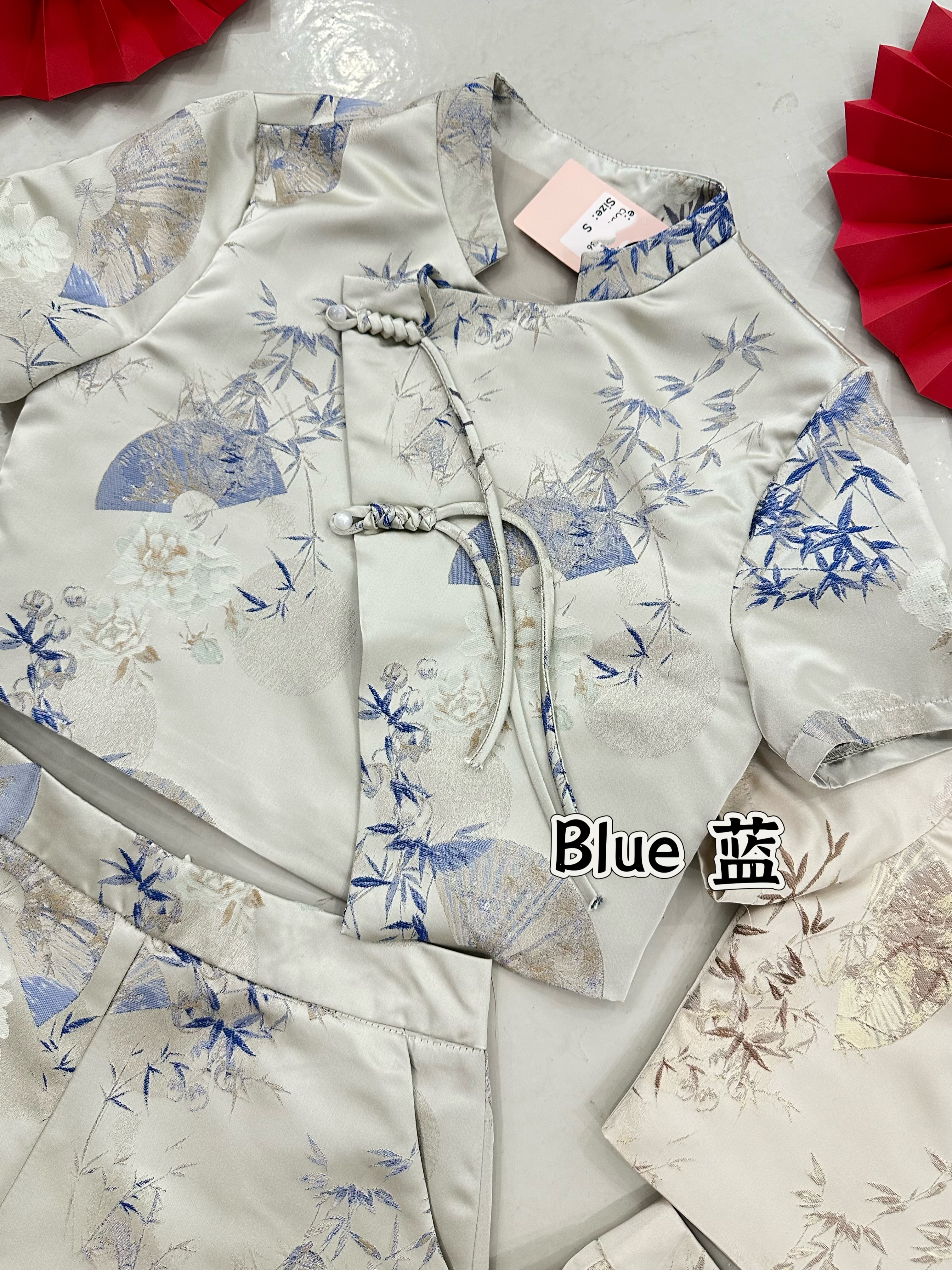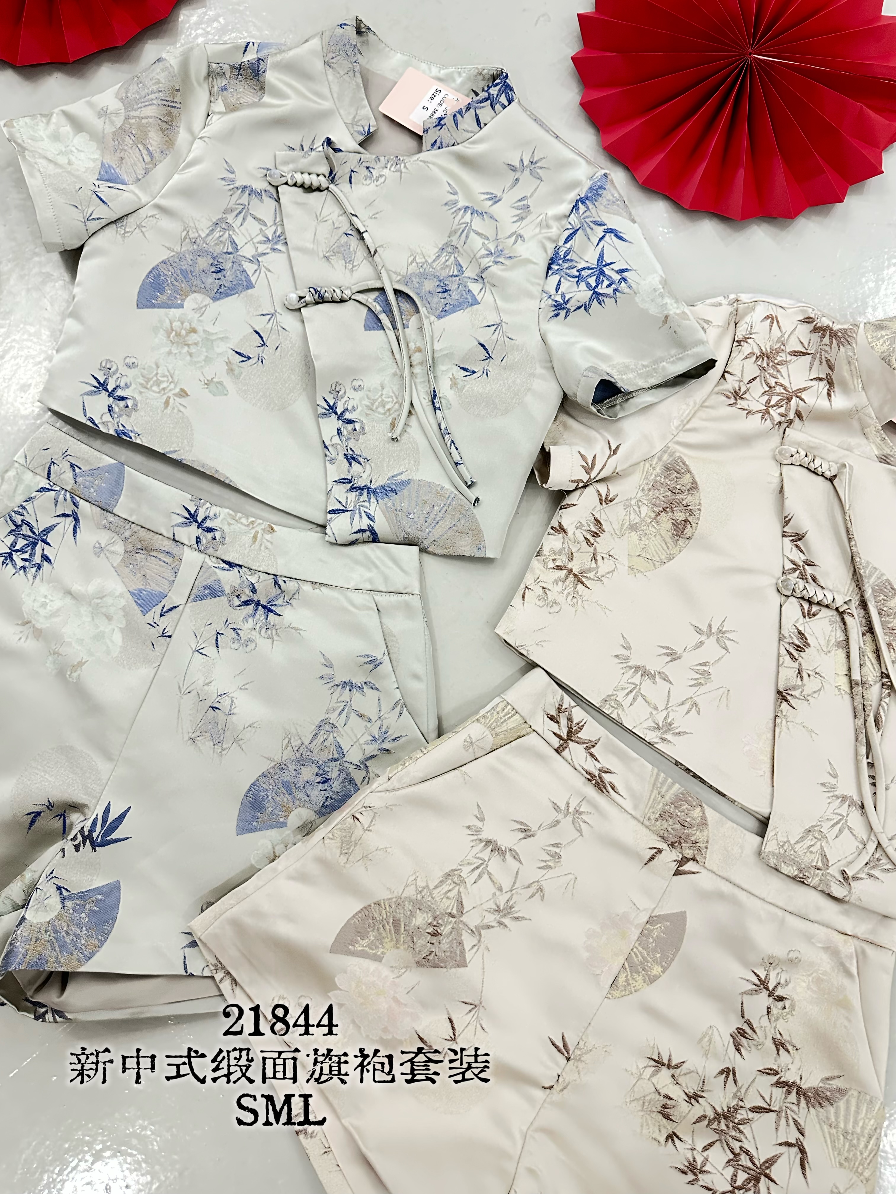 新品推荐✨🪭 21844 CNY SET新中式缎面旗袍套装 颜色:蓝、褐 高端工艺缎面面料、无弹性。双层布料、不刺痒 。 这款很舒服👍 遮手臂显瘦款 S SIZE 胸围 88cm 长40cm 腰围 25-26寸 臀部 92cm 长36cm M SIZE 胸围 90cm 长40cm 腰围 27-28寸 臀部 96cm 长37cm L SIZE 胸围 92cm 长42cm 腰围 29-30寸 臀部 98cm 长39cm 博主163cm/52kg 此款穿S 刚好,供大家参考。