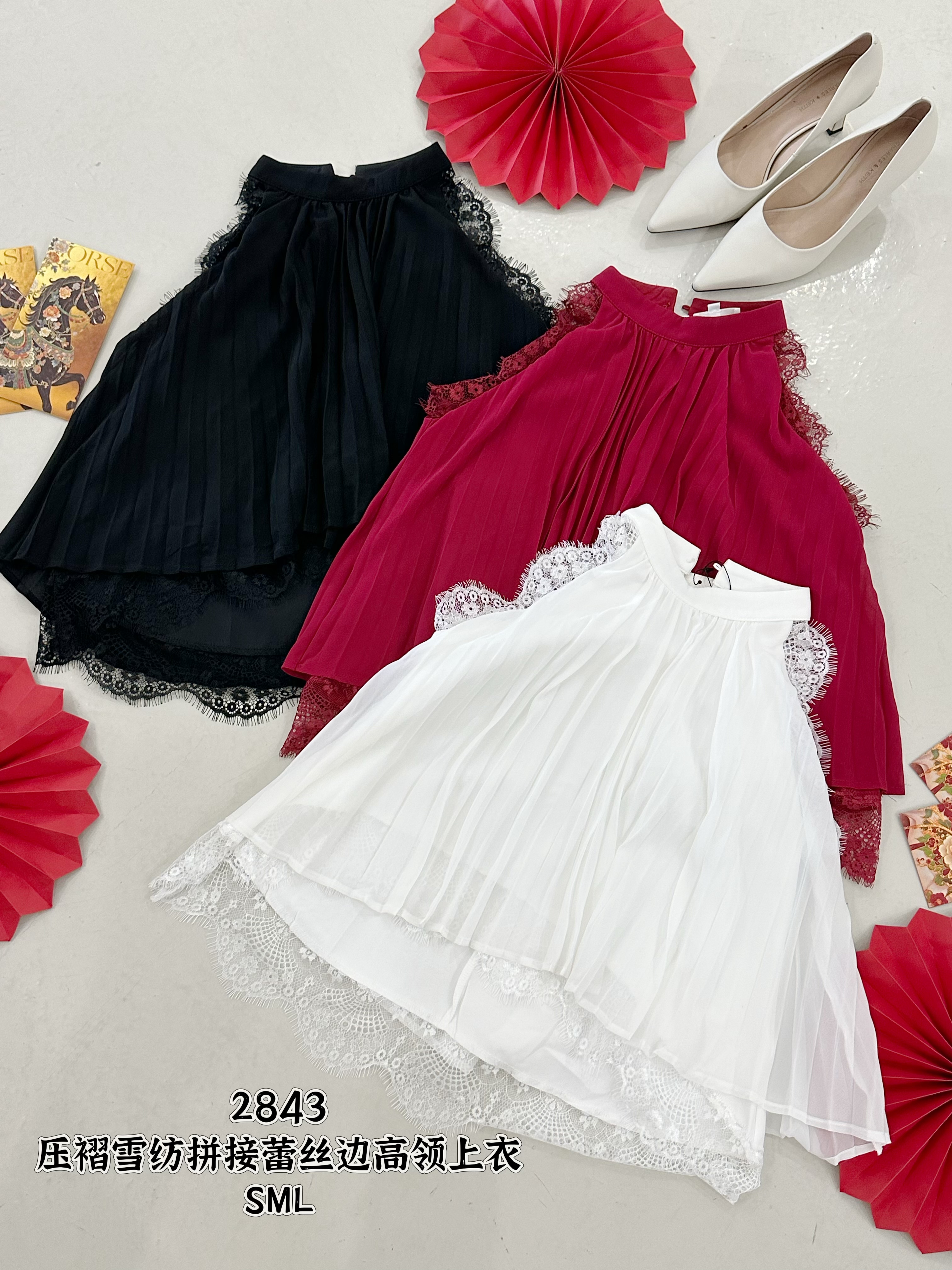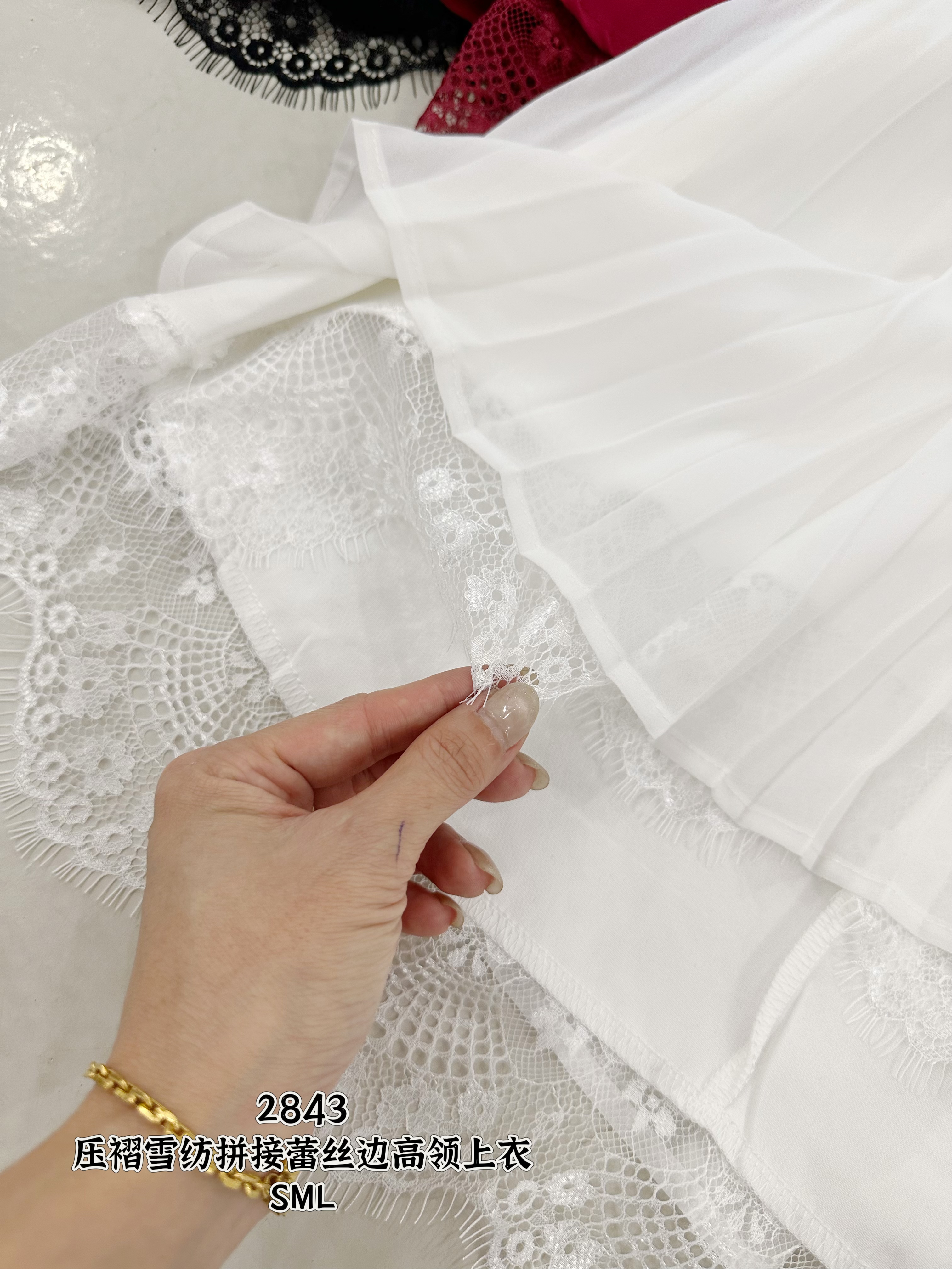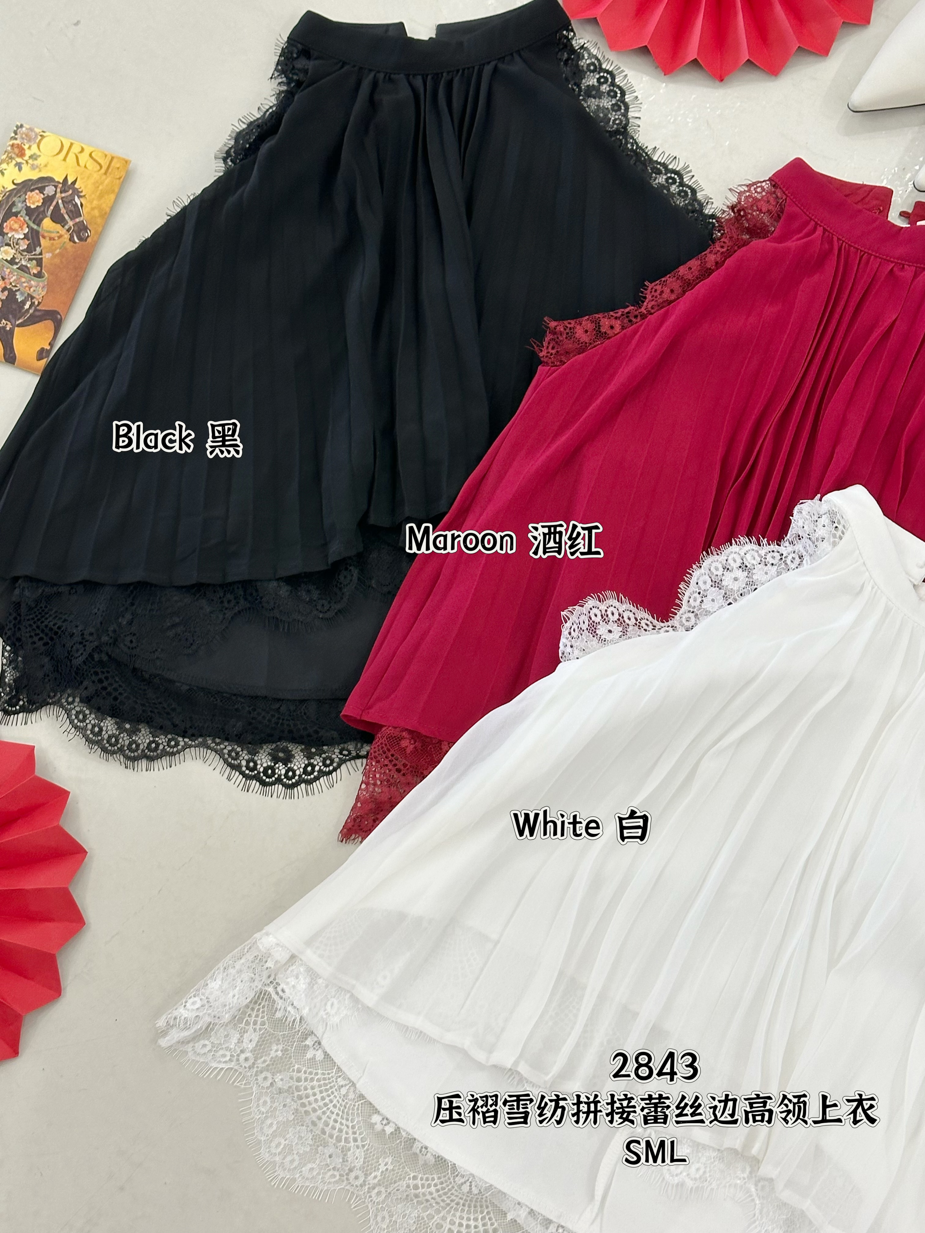 新品推品✨2843 雪纺压褶拼接蕾丝边高领上衣 雪纺压褶面料、有里布、无弹性、 高领但不嘞劲。 👍 蕾丝边太好看了! 添加了衣服层次的设计感 ,前短后长的衣摆设计、绝对绝美😍 博主也自留啦! 颜色:白、酒红、黑 S SIZE 胸围32-34寸 前长44cm 后长60cm M SIZE 胸围34-36寸 前长45cm 后长62cm L SIZE 胸围36-38寸 前长46cm 后长64cm 正常尺寸,根据平时自己的size带即可。 博主平时是S码, 此款穿S是宽松的,供大家参考☺️