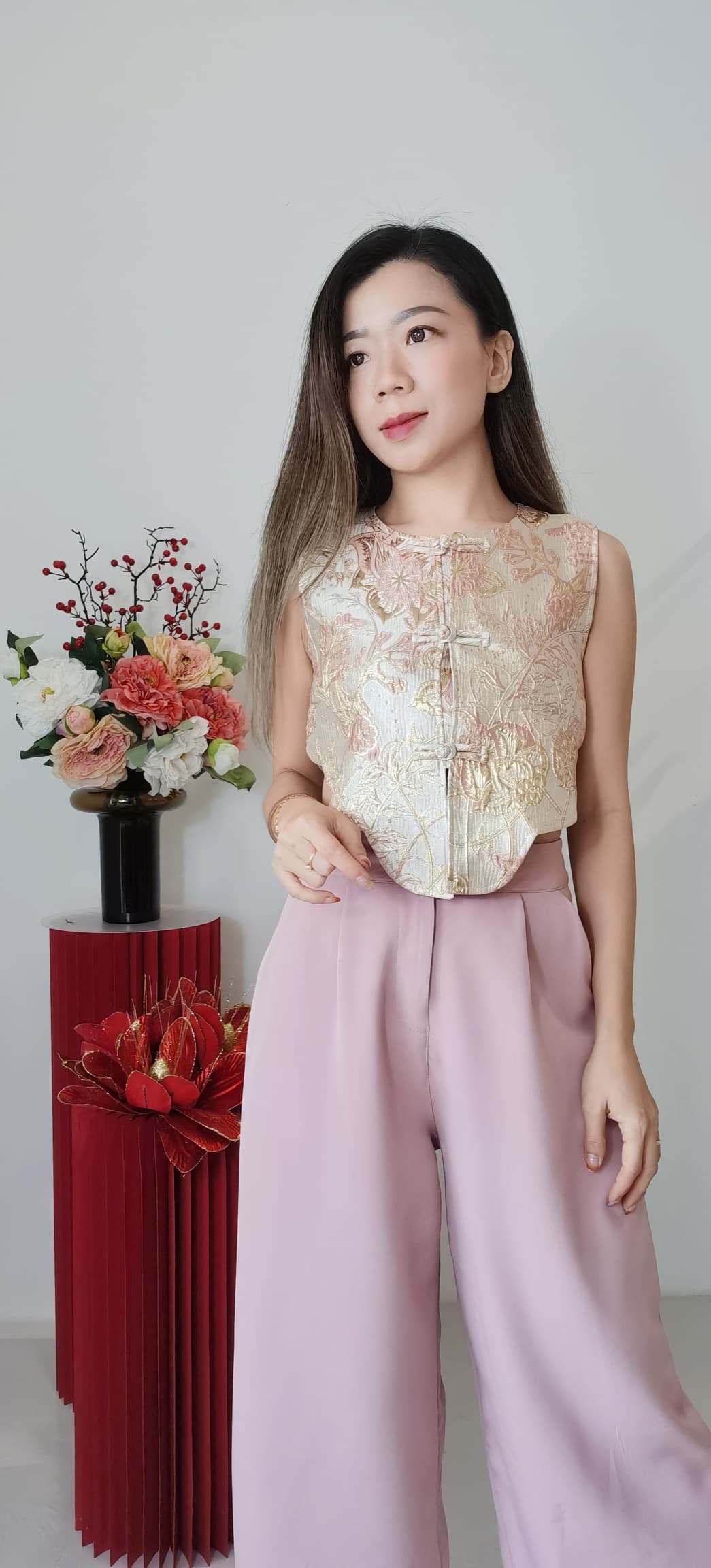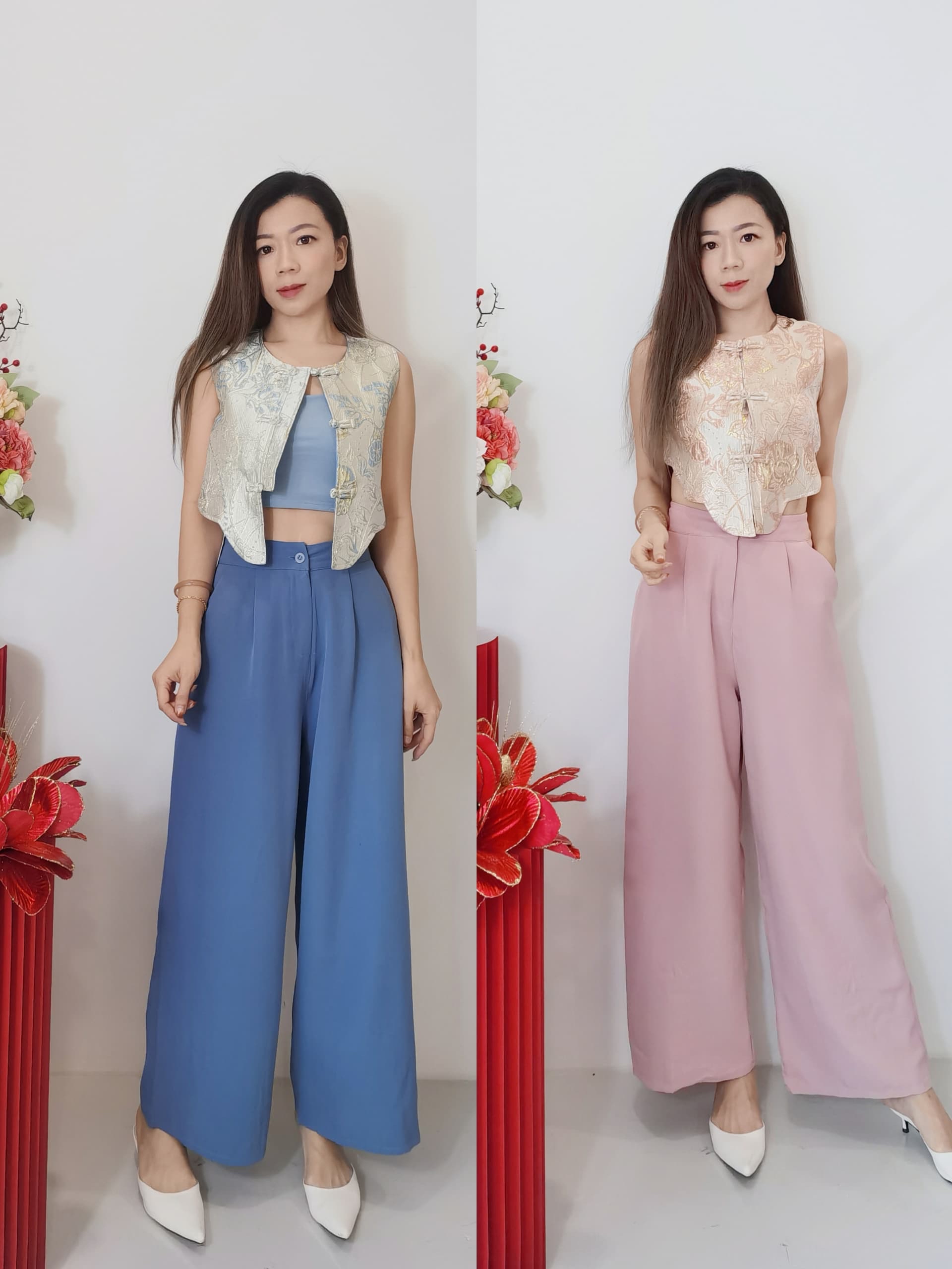 新品推荐 ✨🧧51111 CNY SET 高定浮雕锦锻马甲套装 ✨ 颜色:粉、蓝 高级提花面料 、无弹性 、有里布、不刺痒、侧边笔记短建议搭内搭/穿nudebra 😘 阔腿柔软西装裤 、无弹性。(不包括内搭) S SIZE 胸围 84cm 长44cm 腰围 25-26村 臀100cm 长94cm M SIZE 胸围 90cm 长45cm 腰围 27-28寸 臀110cm 长94cm L SIZE 胸围 96cm 长46cm 腰围 29-30寸 臀120cm 长95cm 根据平时的size下单。 博主163cm/52kg 平时穿S码 , 此款式穿S舒服。 供大家参考