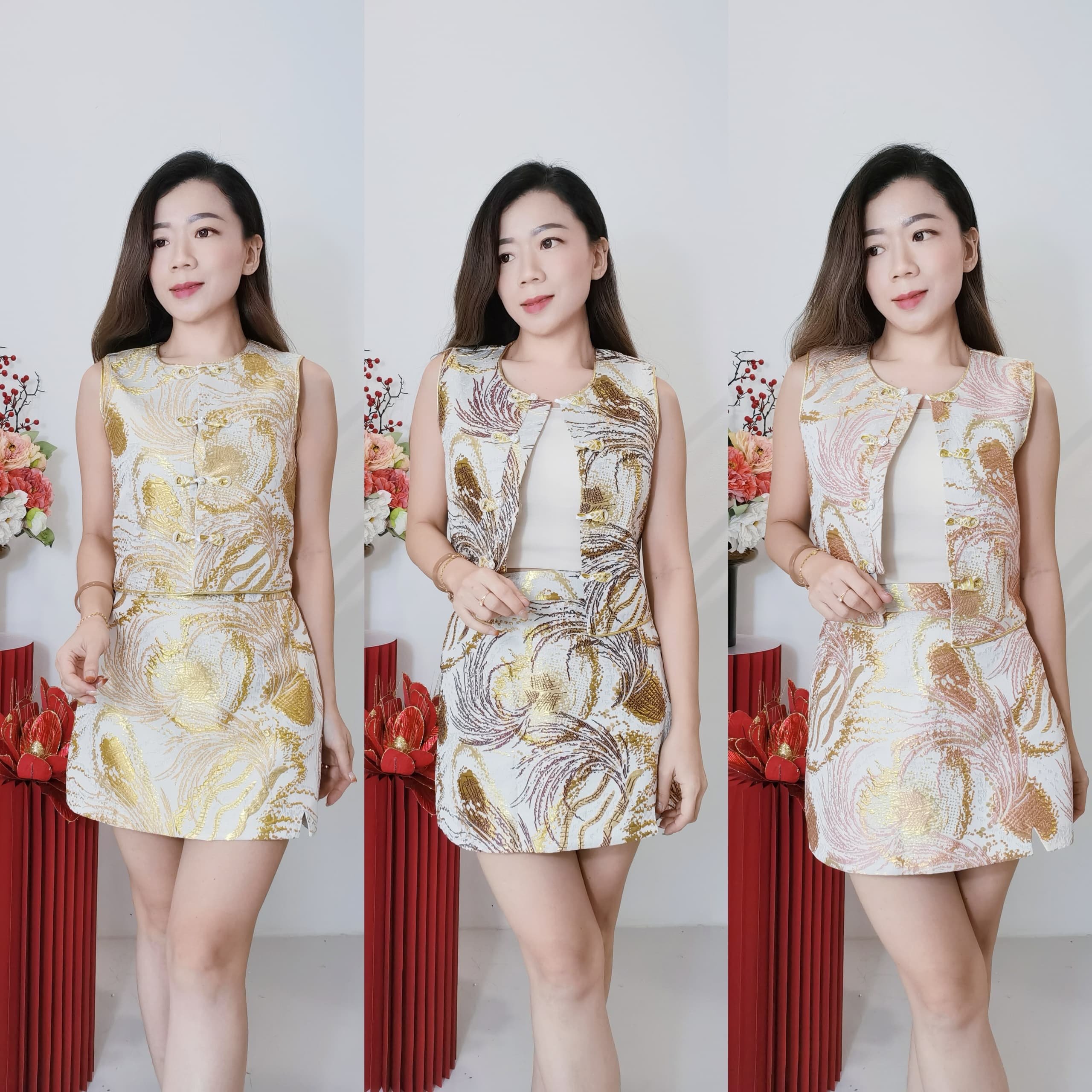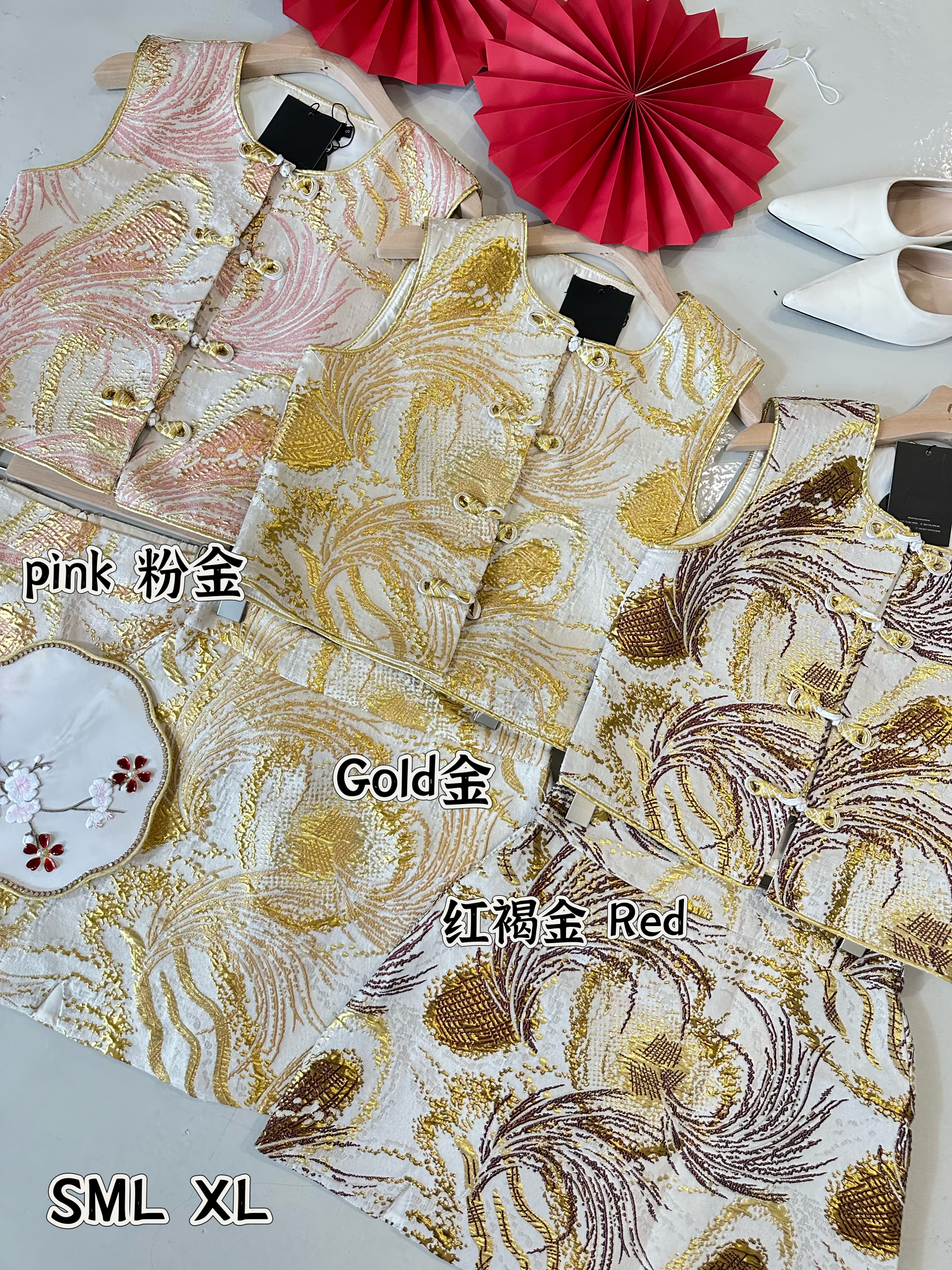 新品推荐 ✨🧧高定新中式刺绣金丝提花套装✨ 颜色:金、粉、褐红 高级重工艺高级提花面料 、无弹性 、 金光闪闪 颜色鲜美😘 裤裙腰围部分做平口弹性申塑 有弹性 穿起来更舒服👍 S SIZE 胸围 84cm 长43cm 腰围68cm 臀96cm 长38cm M SIZE 胸围 90cm 长44cm 腰围 72cm 臀104cm 长40cm L SIZE 胸围 96cm 长46cm 腰围 76cm 臀110cm 长40cm XL SIZE 胸围 100cm 长46cm 腰围 80cm 臀114cm 长41cm p/s : 博主平时穿S,这款穿S舒服☺️ 供参考