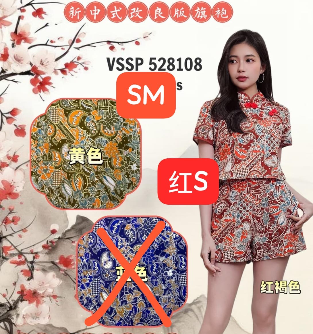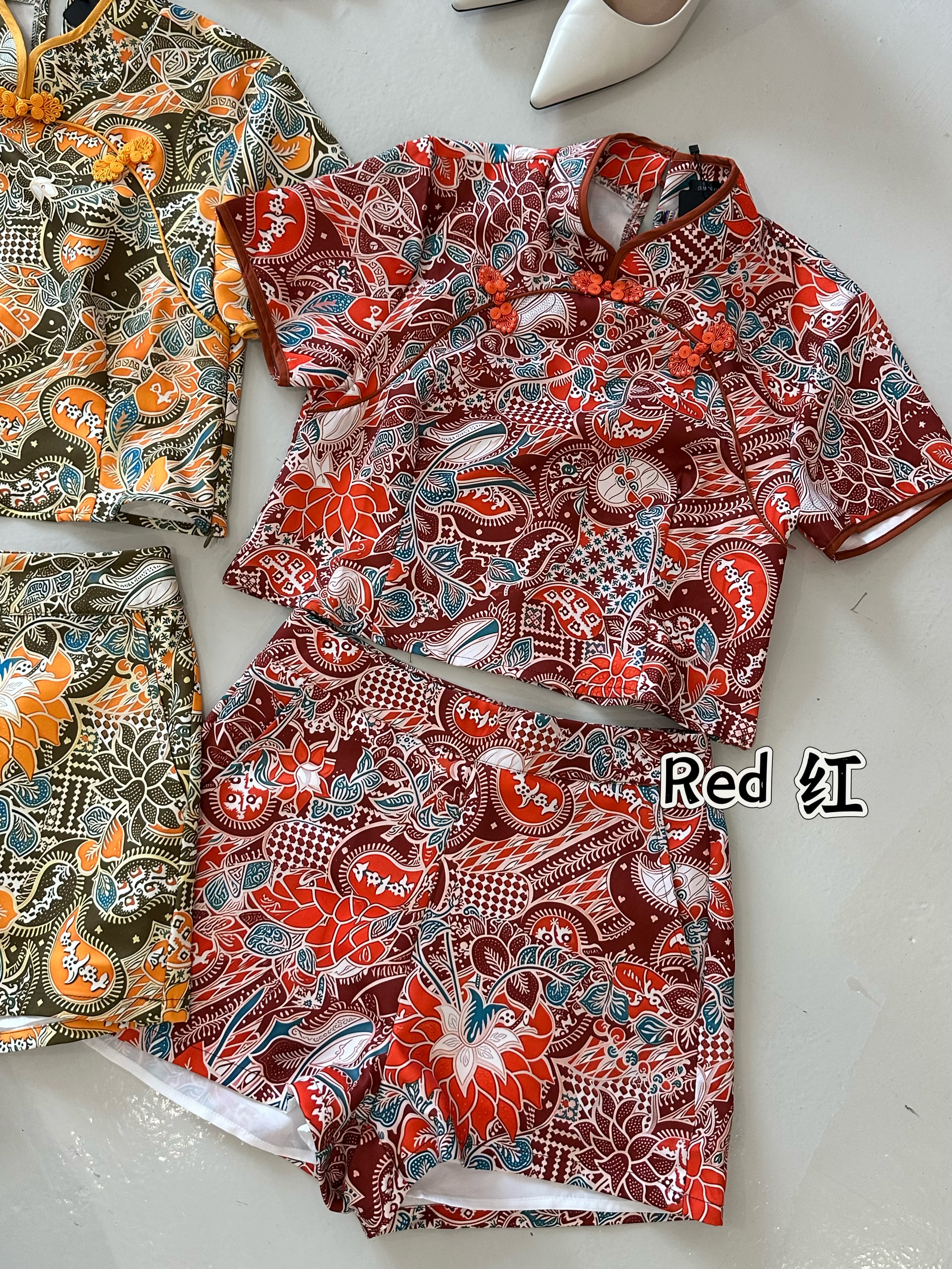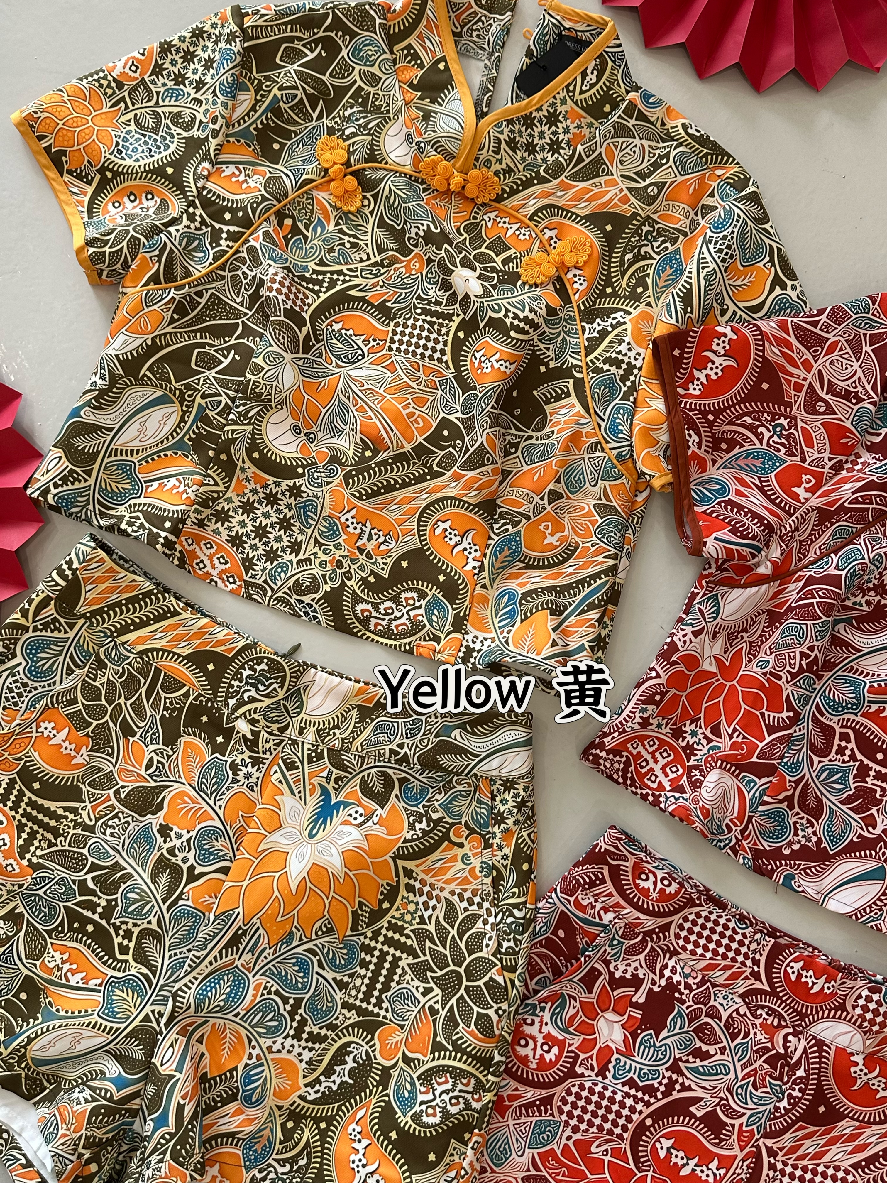 分完货后, 只剩少少货量 爆款推荐✨🧧528108 CNY BATIK SET 高定Batik 新改良新年旗袍套装 时装BATIK丝滑面料、无弹性、上衣侧边拉链、裤子后面拉链! 😍 独特高定的! S SIZE 胸围32寸 长42cm 腰围25-26寸 臀部94cm 长34cm M SIZE 胸围34寸 长43cm 腰围27-28寸 臀部98cm 长36cm 正常尺寸 根据平时的size下单即可. 博主平时S,此款穿S刚好 供大家参考。