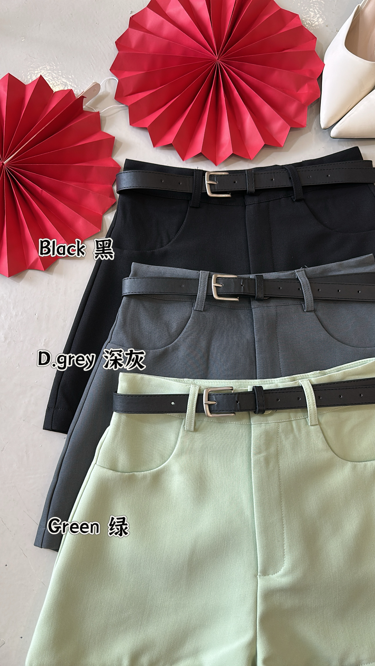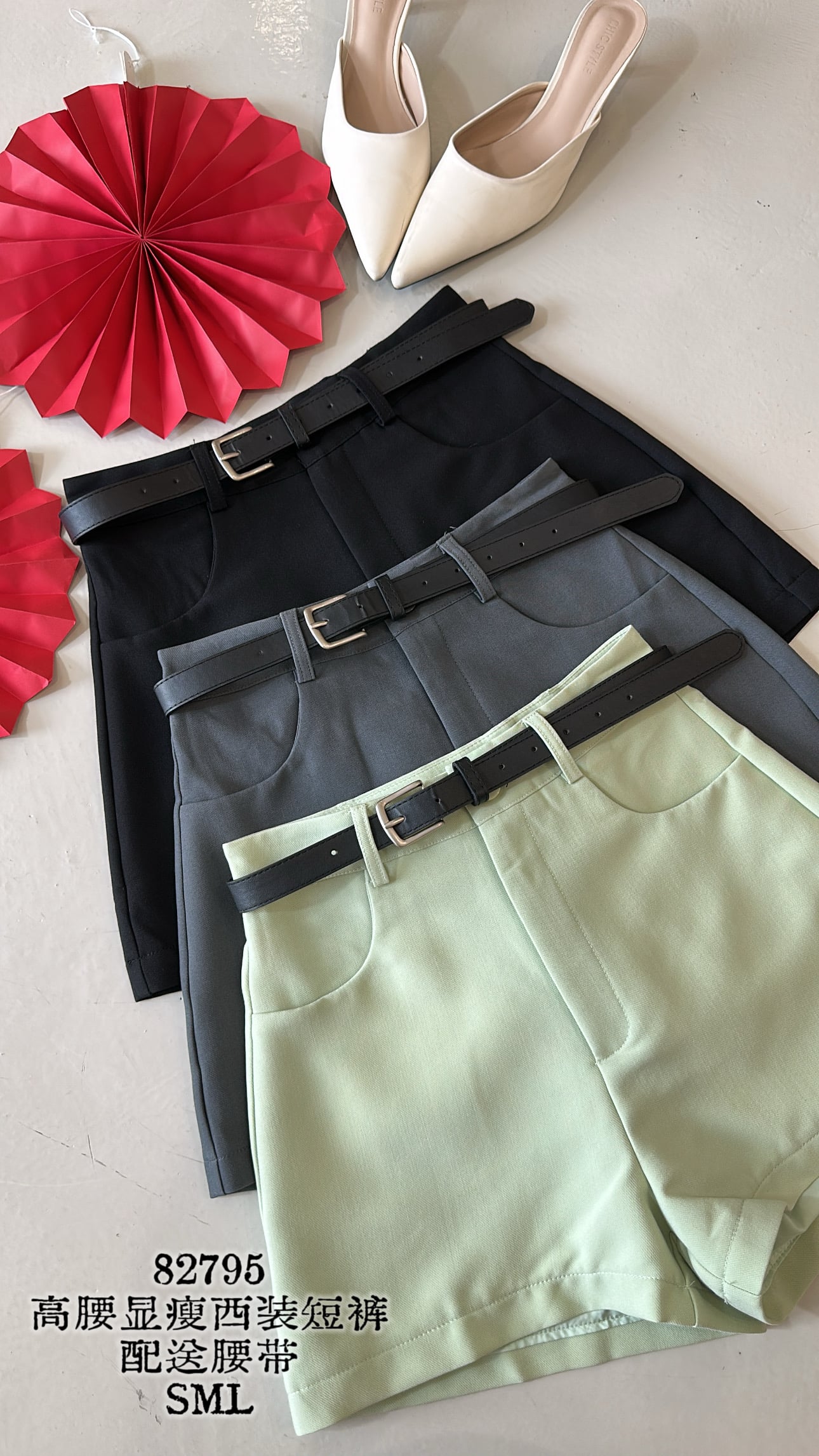 *新品推荐* ✨🪭 82795 高腰显瘦西装短裤 配送腰带 颜色:绿、高级灰、黑 西装布料、有里布、无弹性、显瘦款、赶紧入😍 太美了 S SIZE 腰25-26寸 臀 92cm 长36cm M SIZE 腰27-28寸 臀 96cm 长38cm L SIZE 腰29-30寸 臀 100cm 长40cm 博主163cm/52kg 此款穿S舒服的, 供大家参考。