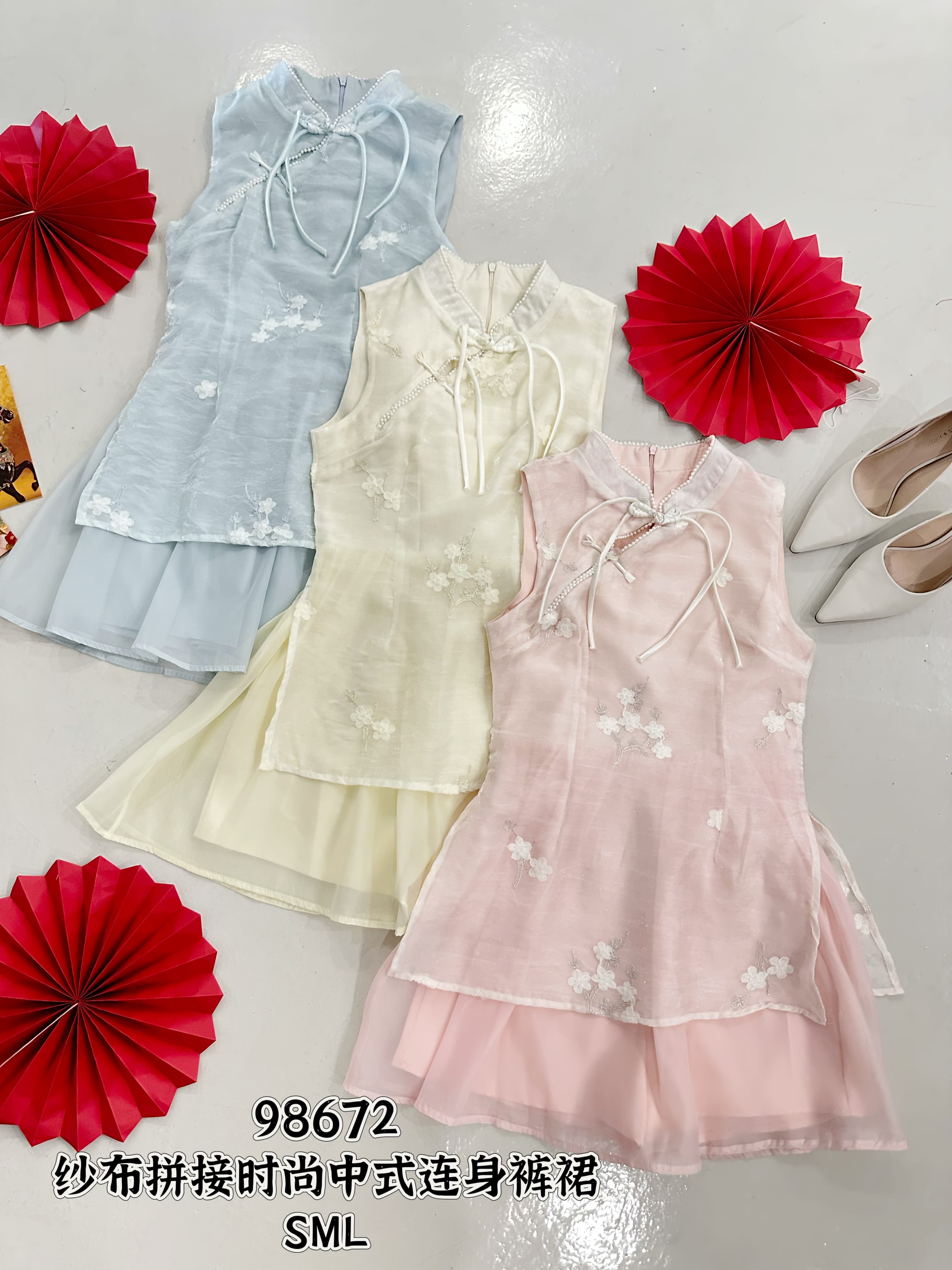 新品推荐✨🧧 98672 纱布拼接时尚中式连身裤裙 高级纱布刺绣花工艺面料 、无弹性 、有里布、不刺痒、很舒服,里面是裤子。 S SIZE 胸围 32寸 腰围25-26寸 长78cm M SIZE 胸围 34寸 腰围27-28寸 长79cm L SIZE 胸围 36寸 腰围29-30寸 长80cm 博主平时穿S,此款穿S刚好舒服, 供大家参考。