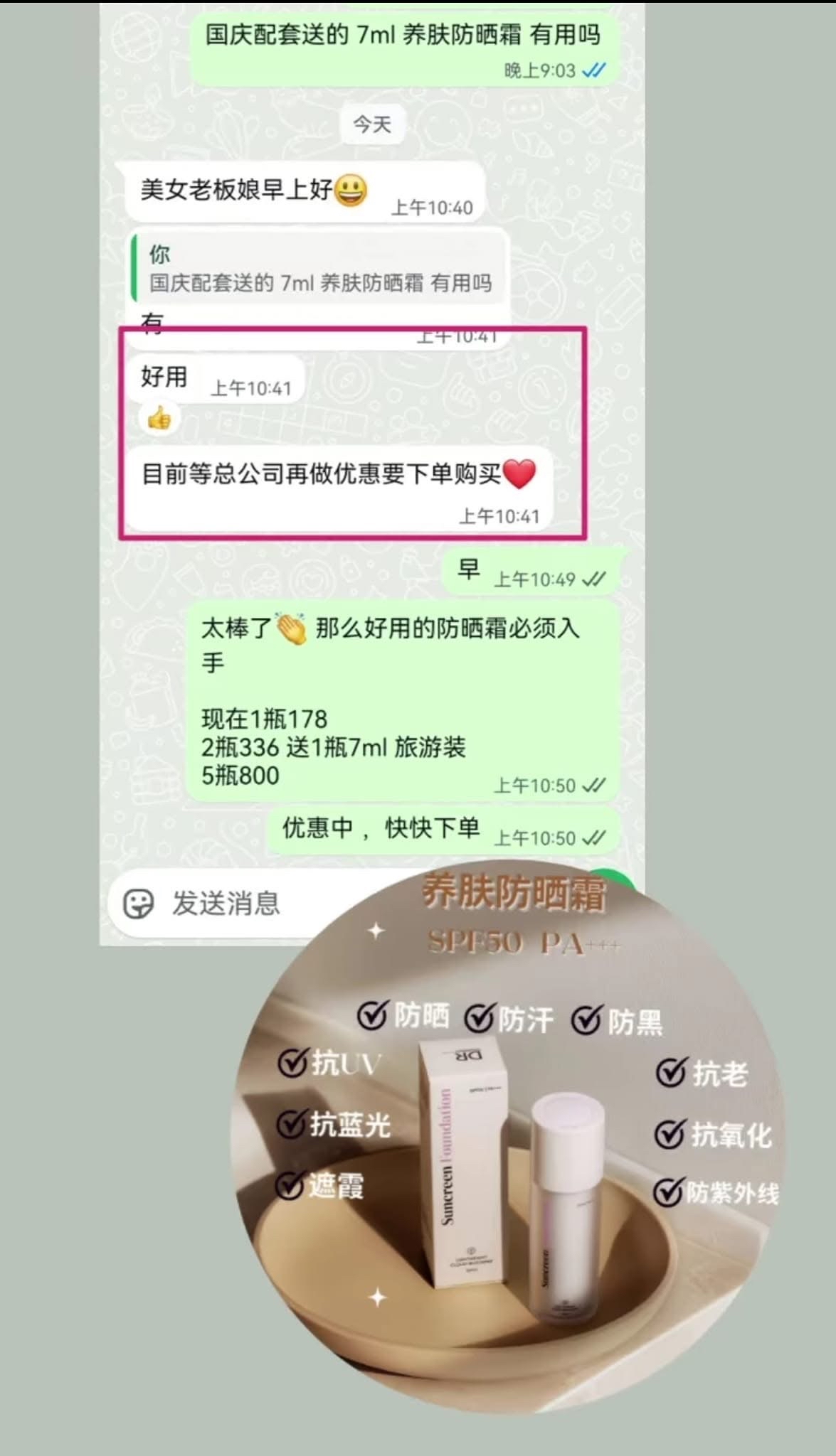 马来西亚的天气☀️好热情呀! ☀️ 想要肌肤好 ,防晒不能少 ꜱᴜɴᴄʀᴇᴇɴ ꜰᴏᴜɴᴅᴀᴛɪᴏɴ ☀️ 🄳🅁 DR ꜱᴜɴᴄʀᴇᴇɴ ꜰᴏᴜɴᴅᴀᴛɪᴏɴ[养肤抗老防晒霜]☀️你一定喜欢 太好用了~😍 ☀️ 养肤抗佬防晒霜 SPF50/PA+++ 📌5大成分 🔅二氧化钛 🔅低分子透明质酸钠 🔅维生素B5 🔅维生素E 🔅生育酚 *主打9大功效:* ✅抗UV/ 抗晒/抗紫外线照射 ✅唯一一款有抗蓝光作用的防晒 ✅抗老/抗氧化 养肤作用 ✅美白养肤 提亮发光 ✅遮霞度超好 呈现美美皮肤 ✅修复肌肤暗沉 重焕光彩 ✅高效保湿 维持肌肤水分 ✅不阻塞毛孔 紧致细腻 ✅防汗效果 不脱妆 不尴尬 ꜱᴜɴᴄʀᴇᴇɴ ꜰᴏᴜɴᴅᴀᴛɪᴏɴ 😚 *防晒防黑防佬遮霞 一瓶就能搞定* ❌妆前,不需要再涂低妆、乳液、气垫、粉低、BB霜、遮霞膏等... 把皮肤搞到卡粉 干巴干巴 又敏感 厚重那样😩 已获得马来西亚NOT政府生产安全认证 ♻️无水银 ♻️无重金属 ♻️无激素 ♻️无毒 用 ☀️ 🄳🅁 ꜱᴜɴᴄʀᴇᴇɴ ꜰᴏᴜɴᴅᴀᴛɪᴏɴ 👍 ♻️采用韩国配方|温和无刺激 ☀️Normal 肌肤/ 敏感肌/ 连孕妇都能安心使用👍 ꜱᴜɴᴄʀᴇᴇɴ ꜰᴏᴜɴᴅᴀᴛɪᴏɴ 刚好合您心意 一款您在找的防晒 👍 99% 回头率高 用过的客户都回不了去了😍 防晒又防老 美丽不打折💖 做你皮肤的“保护伞”🫶🏻 1瓶 30ml 大概可使用4个月左右 适合亚洲人肌肤: 干性、油性、敏感皮肤及孕妇都能安全使用。